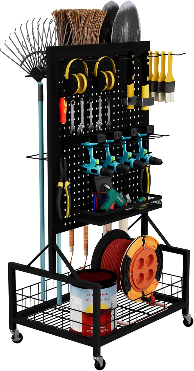 All-in-One Garage Storage Cart with Locking Wheels – Heavy-Duty Tool Organizer with Rack, Pegboard & Hooks & Accessories – Ideal for Garage, Garden, Yard – Utility Cart with Versatile Storage
