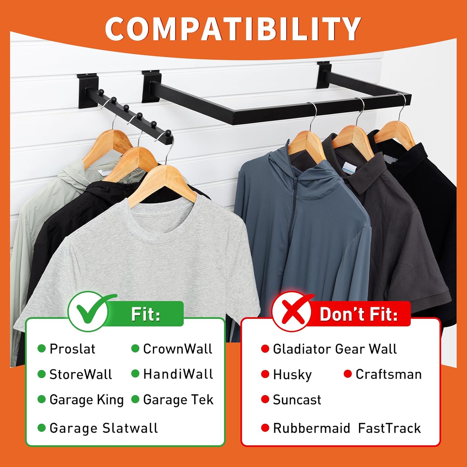 - Effortless Installation: Compatible with standard slat panels such as Proslat, Crownwall, Storewall, Handiwall, Garage King, Garage Tek, and Hello Garage Slatwall-no tools required.