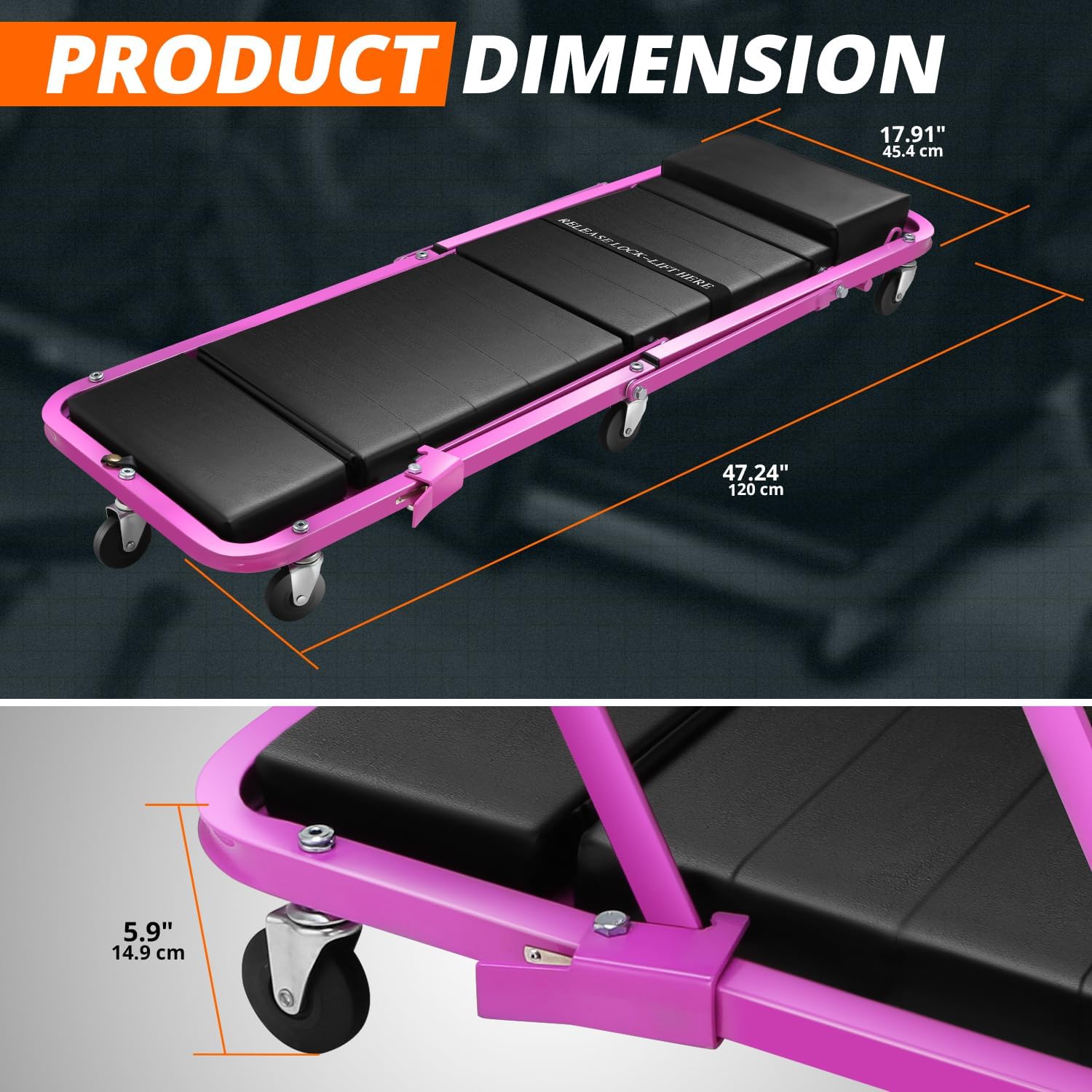 - PRODUCT SPECIFICATIONS - The rolling creeper bench/cart has a maximum weight bearing capacity of 150KG. It measures 1200mm (47.24") long, 455mm (17.91") wide, and 150mm (5.9") high; Allows you to work in your garage or workshop in comfort.