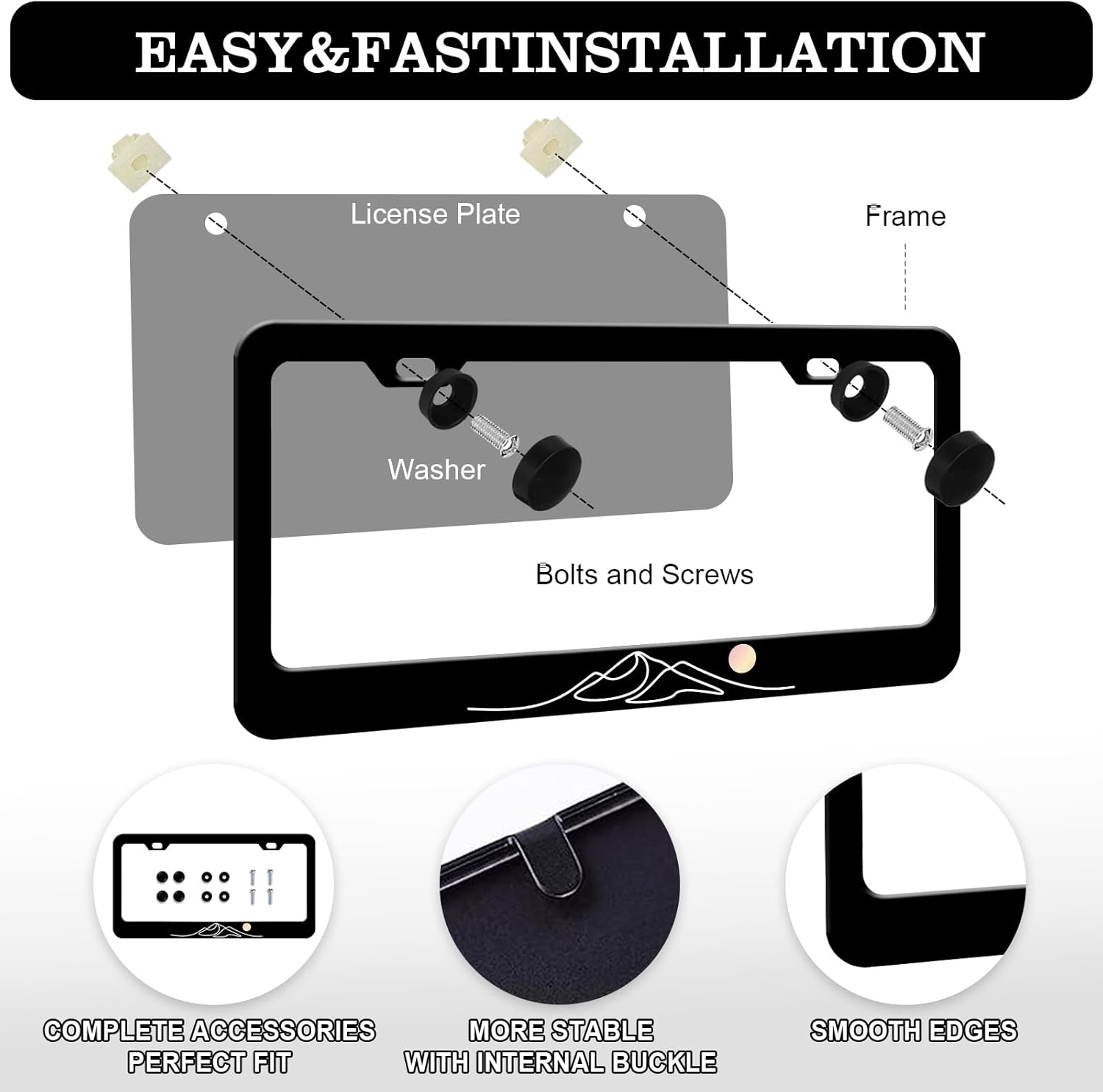 Moon Mountain License Plate Frames - 2 Pack Black Mountain Stainless Steel License Plate Holder,Rust-Proof Waterproof Car Decorative Tag Frame with Screws Fasteners Caps
