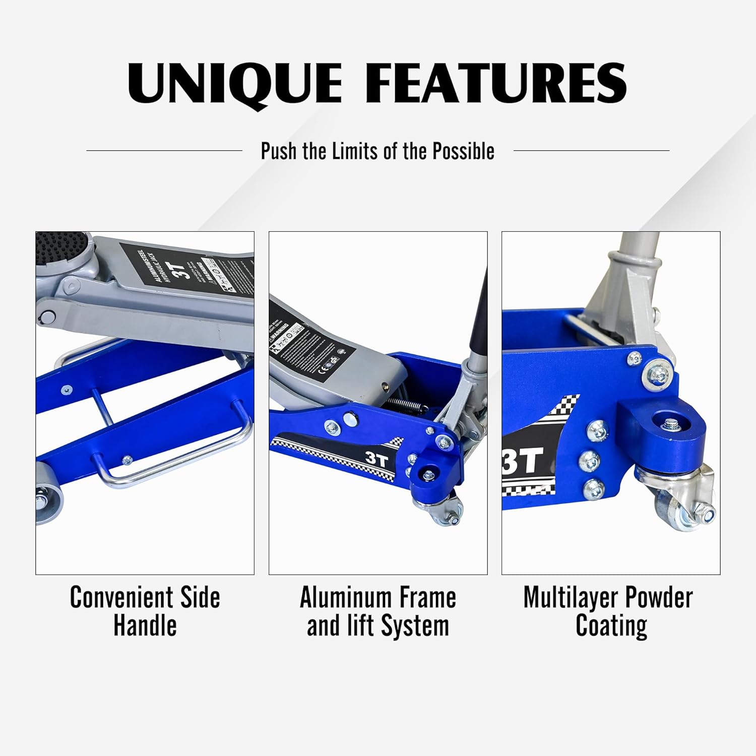 - 【Strong Carrying Capacity】:3 ton/6600lbs capacity, can help you lift the car height, not only can professionals use, daily travel weekend trip encountered problems, but also can be used for maintenance.It adopts dual pump system to provide you with efficient work.