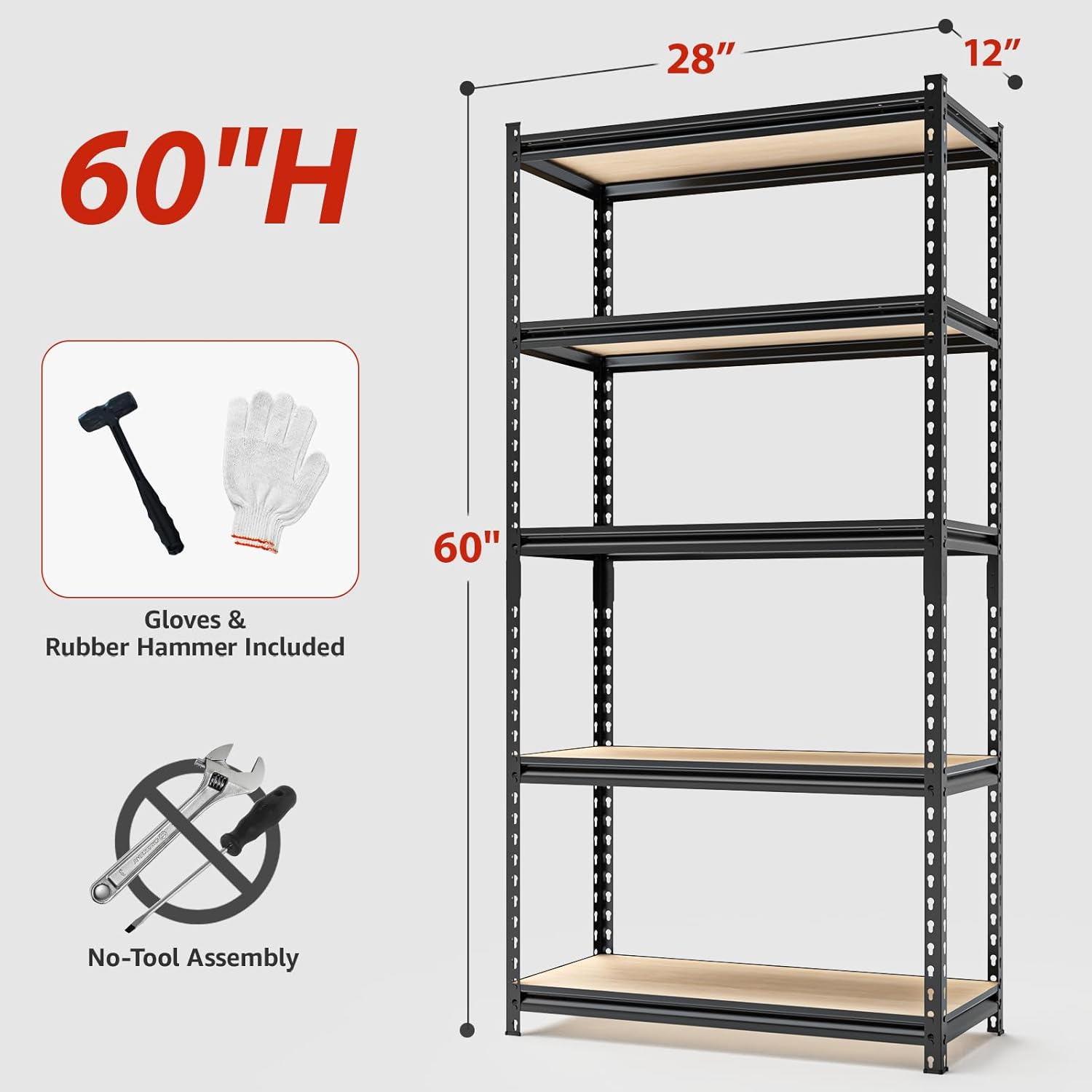 - 【Pro Storage Dimensions】: 60"H x 28"W x 12"D fits SUVs/trucks garage clearance; 28-inch width stores 2x common plastic buckets side-by-side; 5-tier design creates vertical storage zones for bulk buys; Commercial-grade for workshops/warehouses