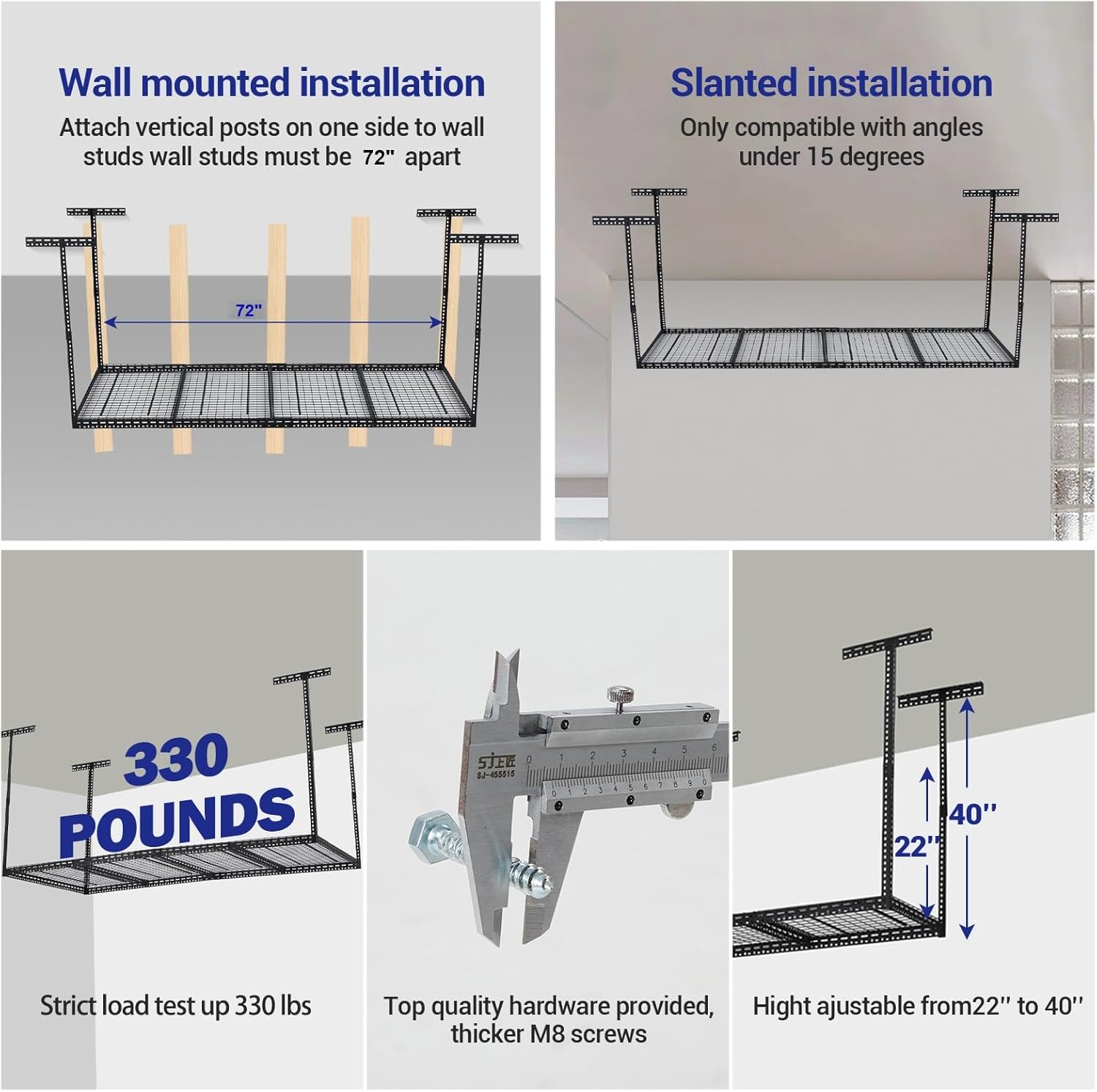 - ✅ Versatile Height Adjustment (22"-40"): Customize your overhead storage rack to fit any ceiling height or storage need. Easily adjust from 22 to 40 inches to maximize vertical space, accommodating tall items in your garage or clearing obstacles in low attic areas. Perfect for seasonal gear or bulky supplies.