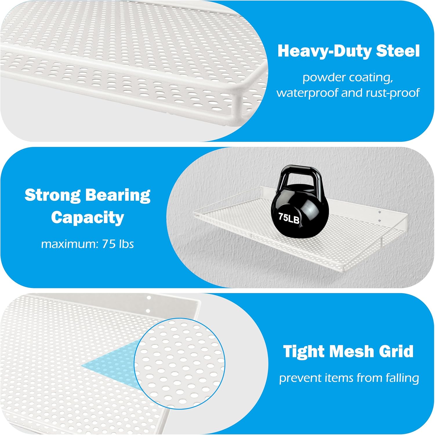 - Heavy-Duty Wall Shelves: Garage wall shelving are made of high-quality steel to ensure the stability and durability. The surface is treated with powder coating and polished finish, waterproof and rust-proof, and keeps clean and new for a long time use.