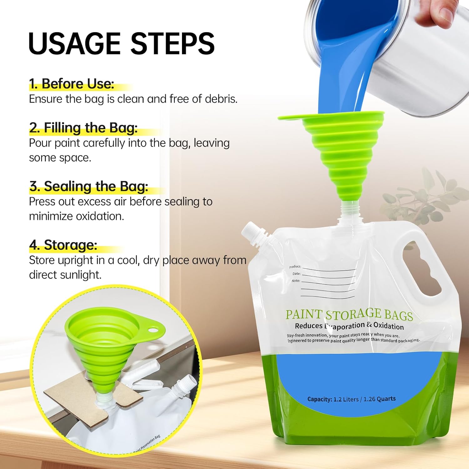 - Complete paint storage kit: Includes 4 reusable paint storage bags, a precision funnel for easy filling, and secure sealing clips.