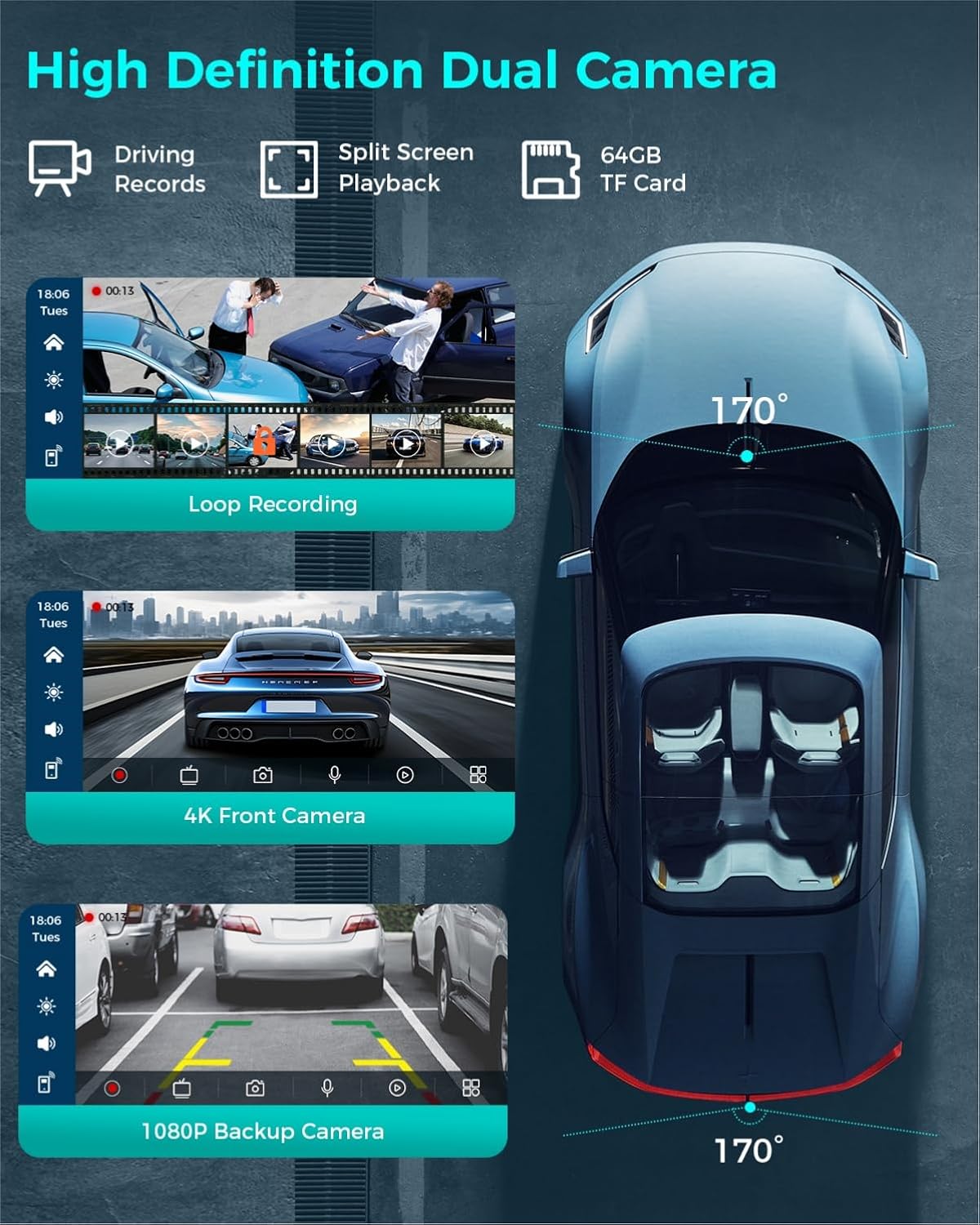 - 4K HD + 1080p Dual Cameras: Capture crystal-clear footage day or night with the upgraded 4K front dash cam and waterproof 1080p rear camera. Dual-loop recording (includes 64GB TF card) ensures full journey coverage