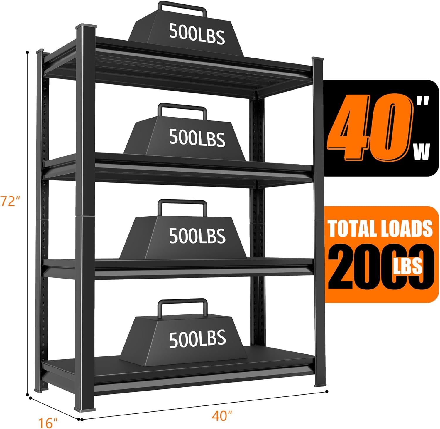 40in Wide Garage Shelving Heavy Duty,2000lbs Large Loads Adjustable Garage Storage Shelves,All Metal Storage Racks and Utility Rack Shelves, 40”W x 16”D x 72”H (Black)