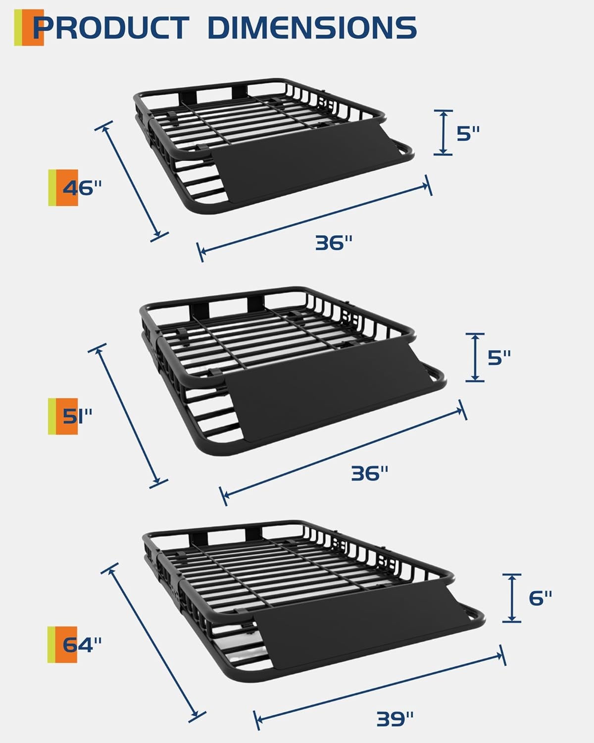 - 【LARGE STORAGE CAPACITY】Free up space in your vehicle with this roof rack cargo basket that can hold up to 200 Lbs. Overall dimensions include: 51"(L) x 36"(W) x 5"(H)
