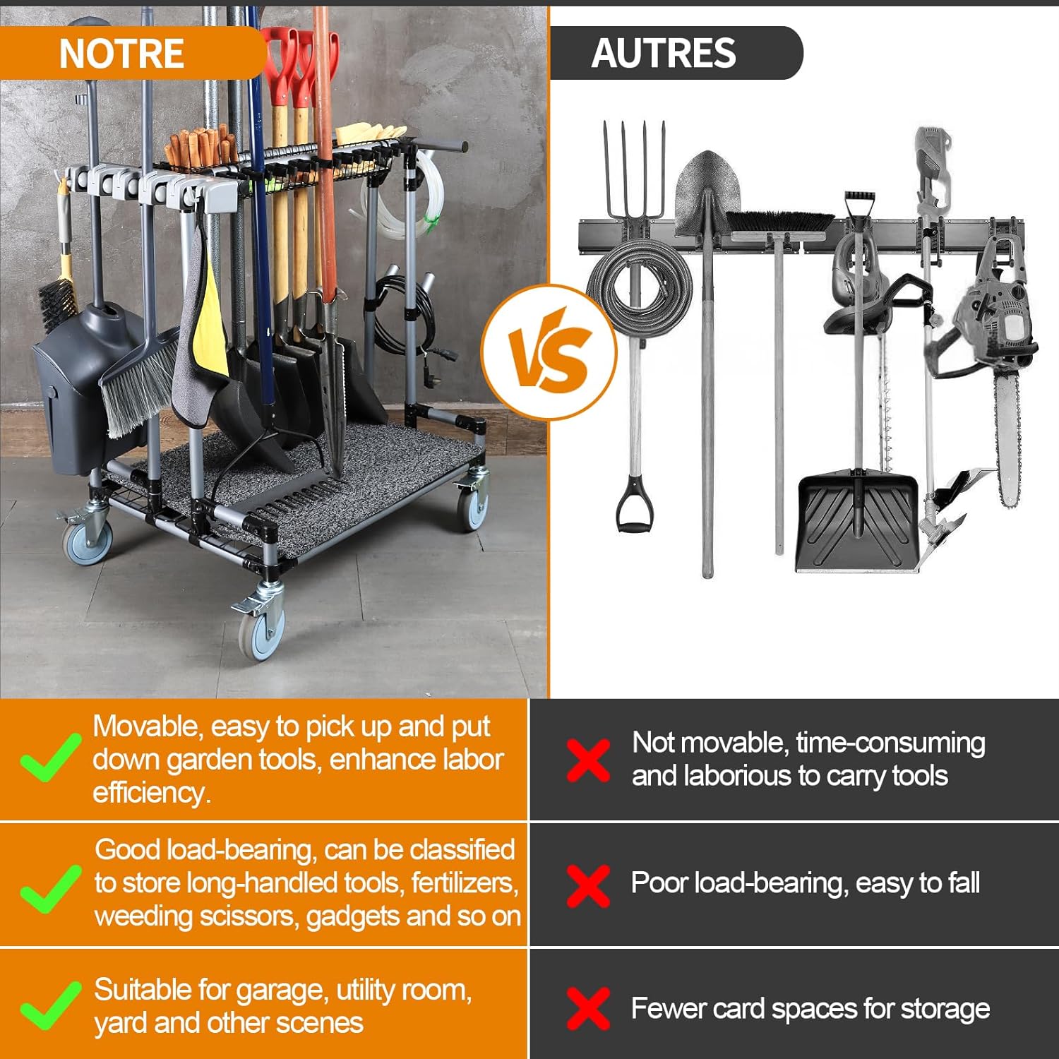 Heavy-Duty Garden Tool Organizer Cart Ideal for Gardening, Upgraded 5-Inch Wheels for Lawn & Sand, Long-Handle Tool Storage