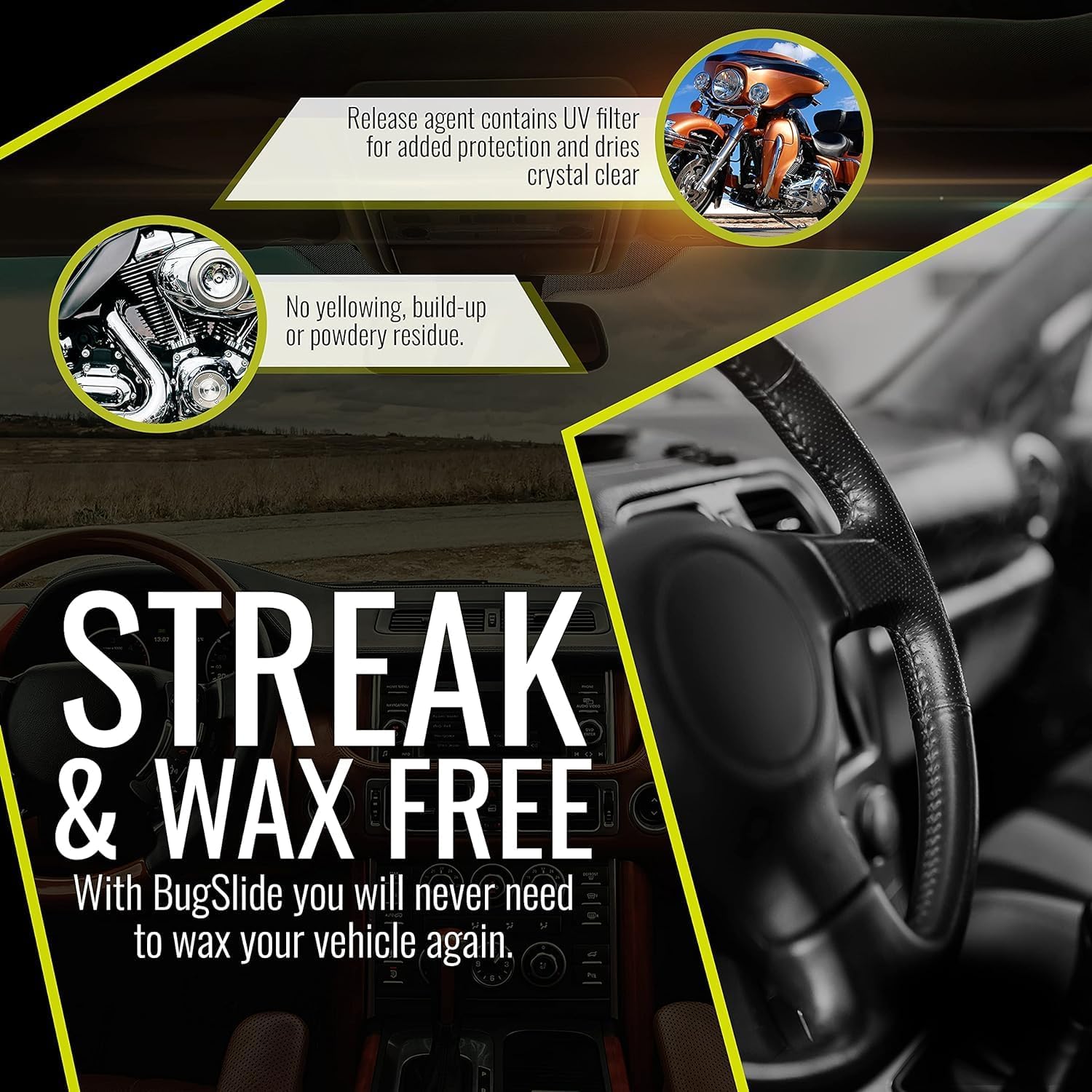 - Streak and Wax-Free – With BugSlide you will never need to wax your car again. Applied and paired best with a microfiber cloth towel to wipe clean, the release agent contains a UV filter for added protection and dries crystal clear with no yellow tint, film, build-up or powdery residue.