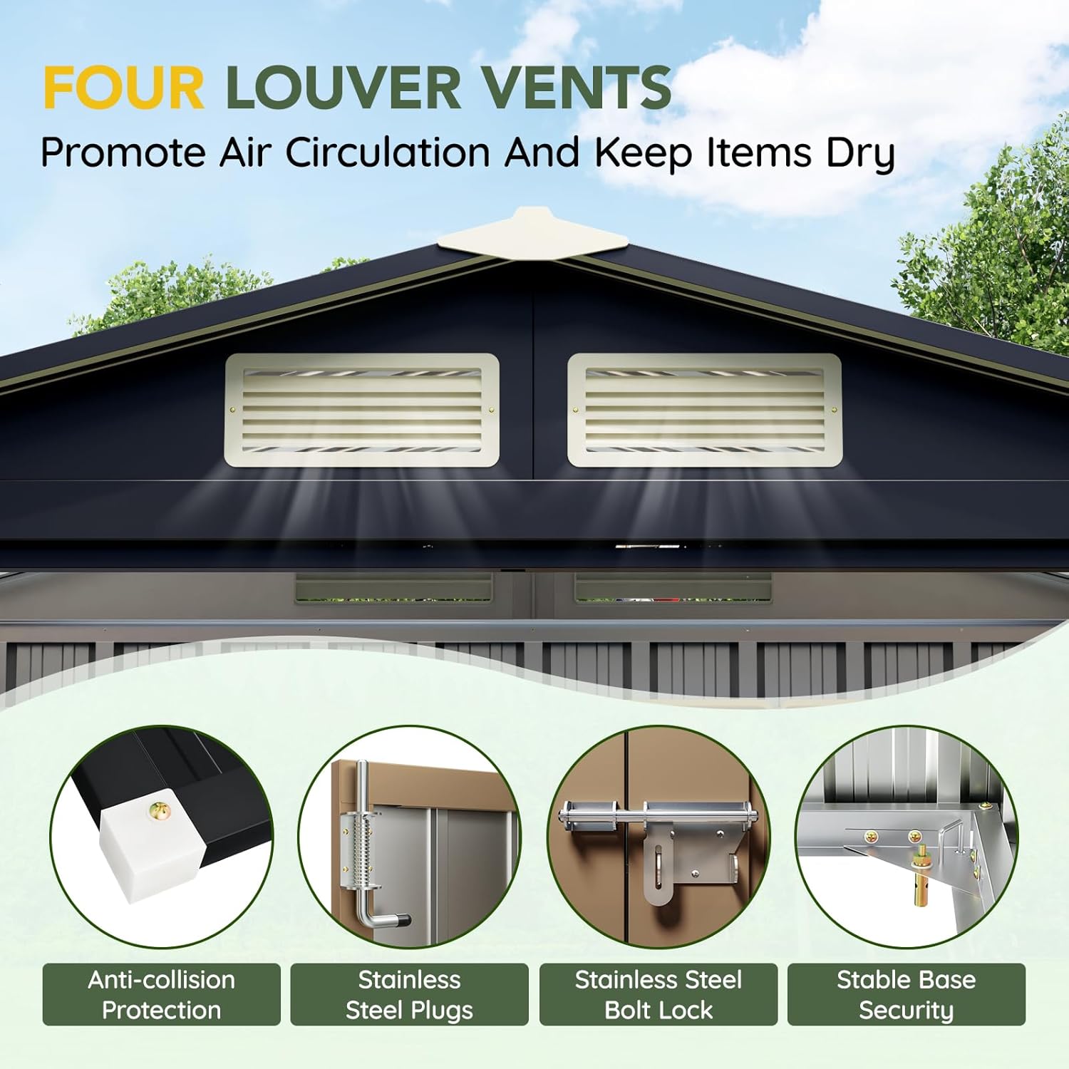 - Includes Reinforced Steel Base Frame – Comes with a pre-engineered steel base that provides a stable and level foundation, making installation easier and enhancing the shed’s overall structural integrity. Simply add plywood or concrete blocks on top for a complete floor.