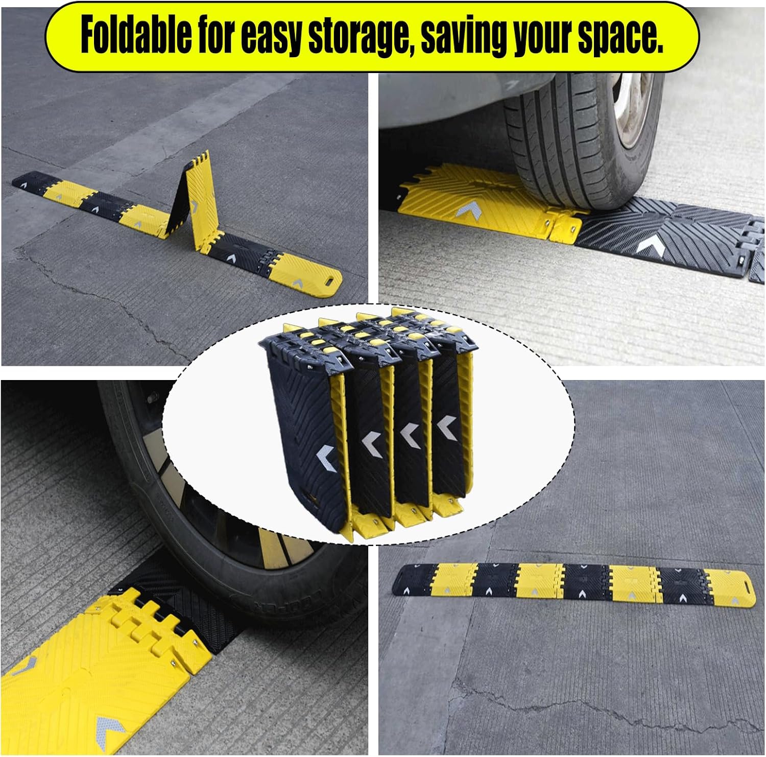 - One-second folding for easy storage - These portable rubber speed bumps feature a unique foldable design, allowing them to be quickly unfolded or put away in 3 seconds, reducing the storage volume by 70%. They can be easily placed in the trunk or corner, ready for use at any time.