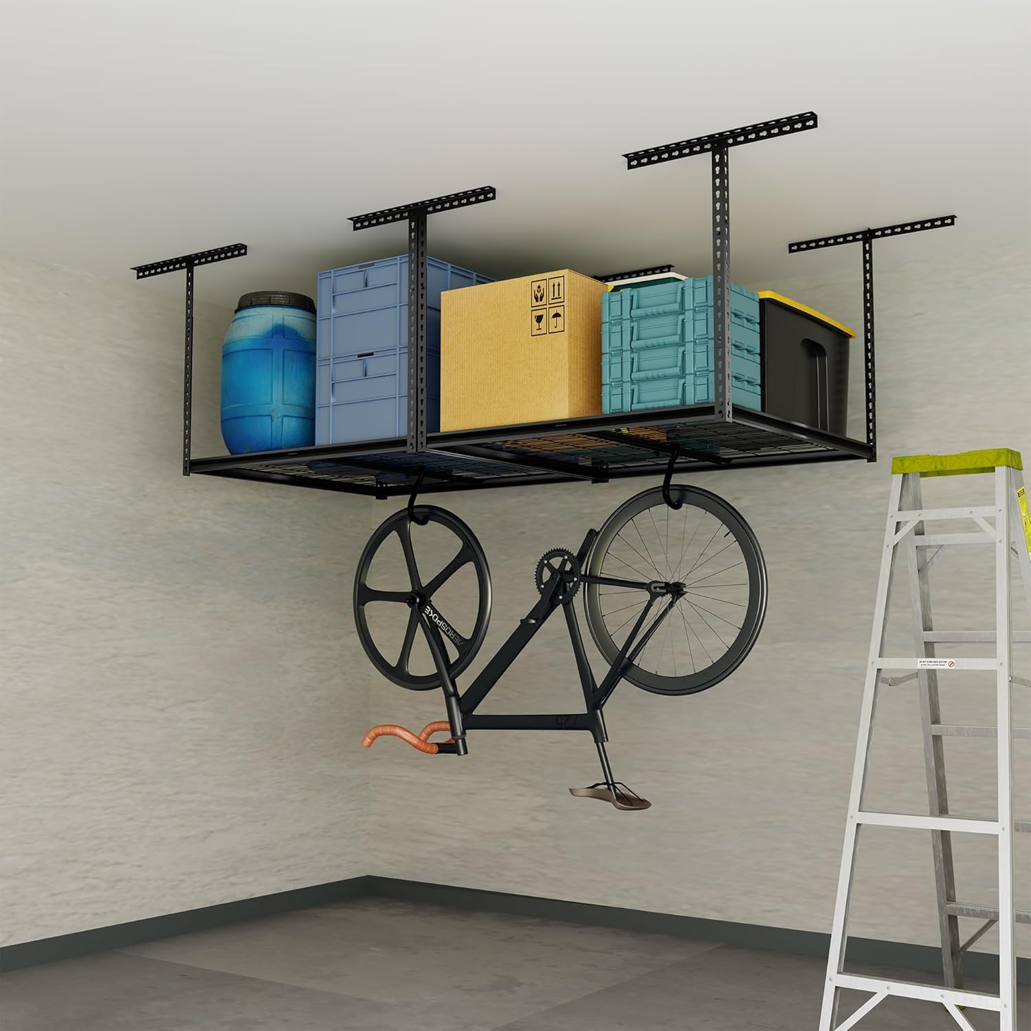 - Industrial-Grade Capacity: Made from thick steel with dual-wire grid support, this overhead garage storage rack holds up to 900 lbs, perfect for tires, toolboxes, and seasonal items. Powder-coated for rust and scratch resistance.