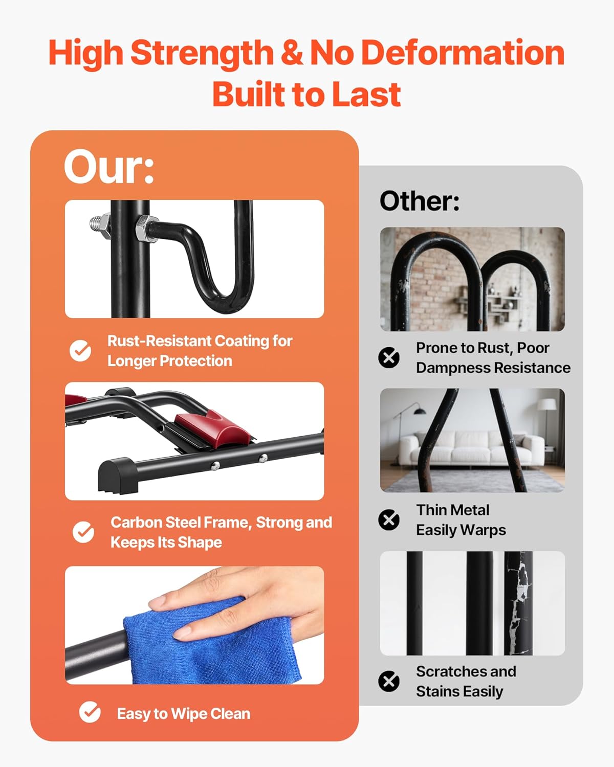 - Built to Last: The garage bike stand has a rust-resistant coating to slow down corrosion. Its tough carbon steel frame is solid and won’t bend, so you can trust it to hold your bike for years to come