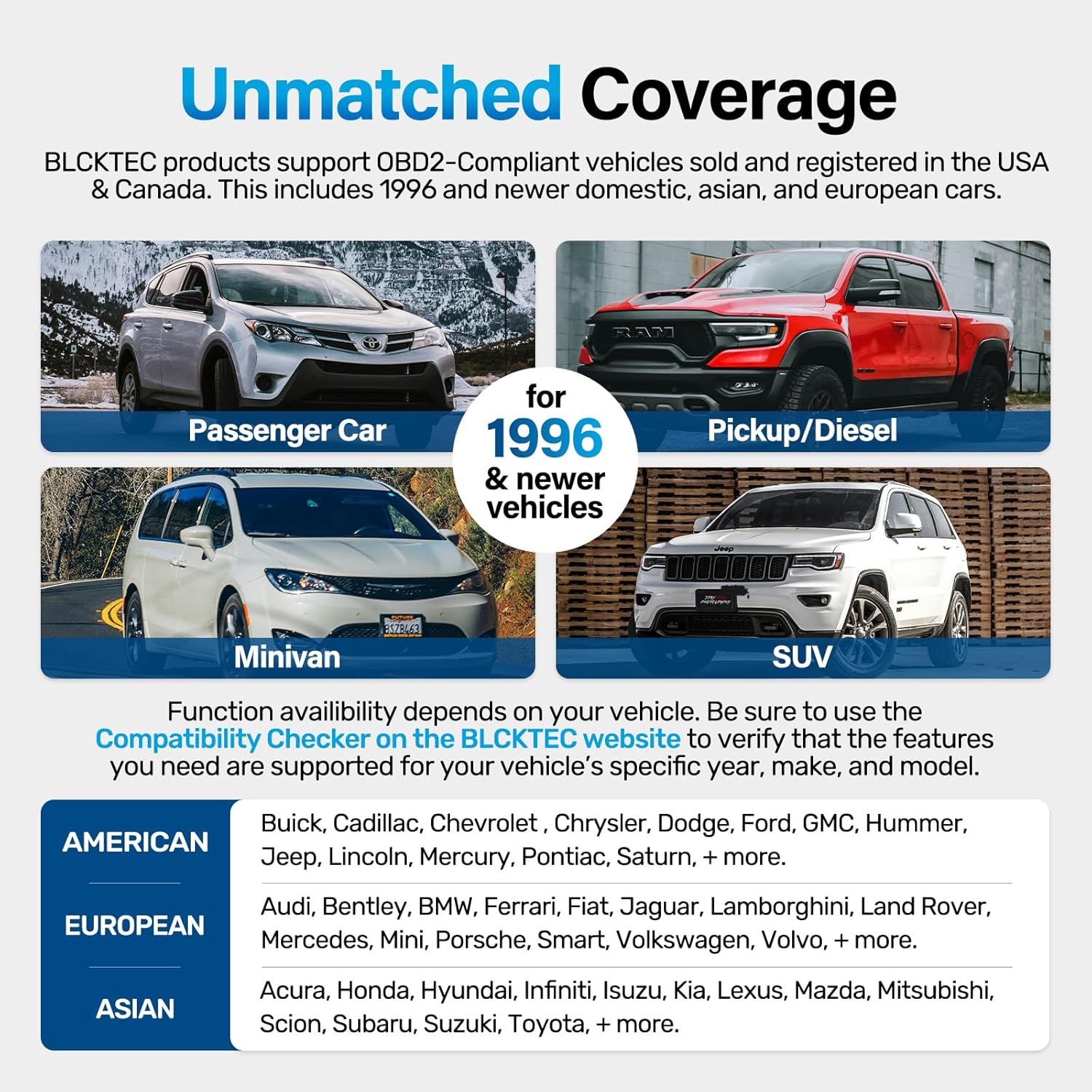 - [Free Lifetime Update, Unmatched Vehicle Compatibility] - The BLCKTEC 420X comes with free lifetime updates, ensuring your scanner always has the latest diagnostic technology and supports new vehicle models. The 420X is compatible with all OBD2-compliant vehicles sold and registered in the USA and Canada from 1996 onward. This includes passenger cars, minivans, SUVs, pickups, light-duty trucks, and diesel vehicles manufactured by domestic, Asian, and European automakers.