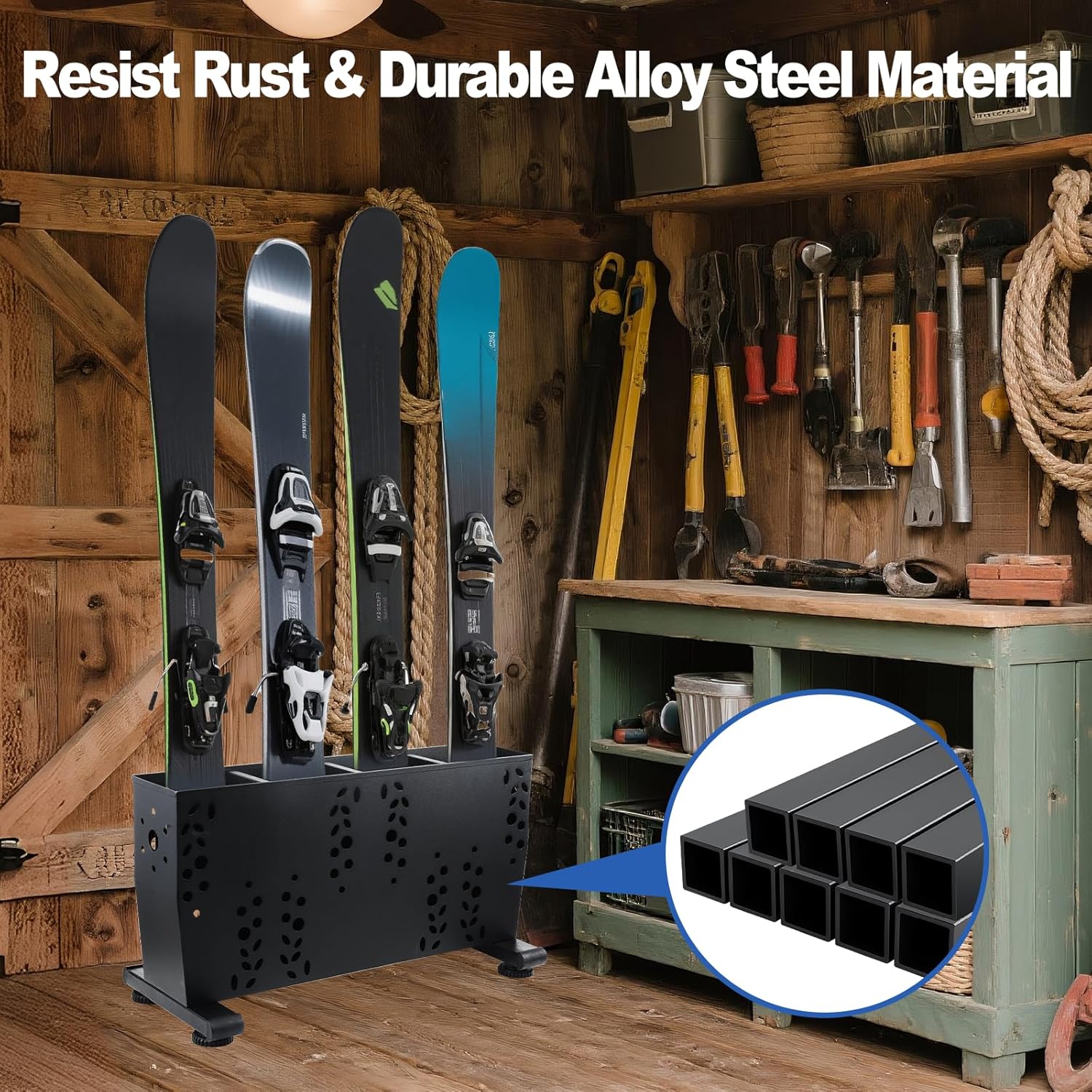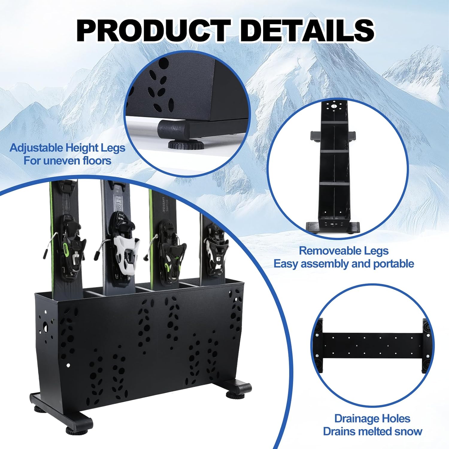 - 【4 PAIRS FREESTANDING SKI RACK】Holds up to 4 pairs of ski + poles. Holds skis up to 140mm wide at the tails, including race skis, all-mountain skis, twin tips, and powder skis. A perfect ski organizer for your garage, or ski lodge.