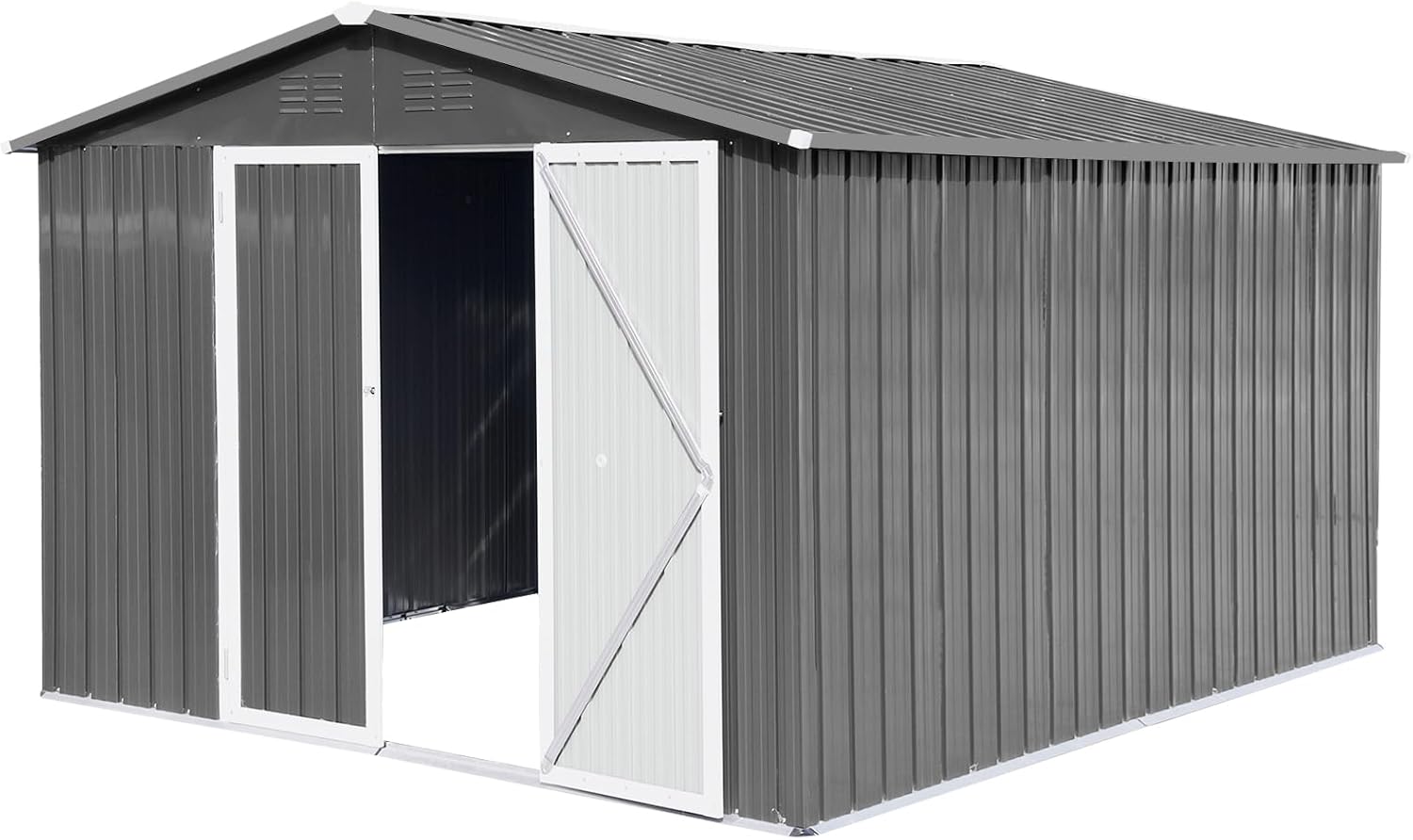 12 x 10 FT Metal Garden Shed, Outdoor Storage Shed with Heavy-Duty Steel Construction, Built-in Punched Vents & Hinged Door, Free Padlock for Secure Backyard, Patio & Garage Storage, Grey