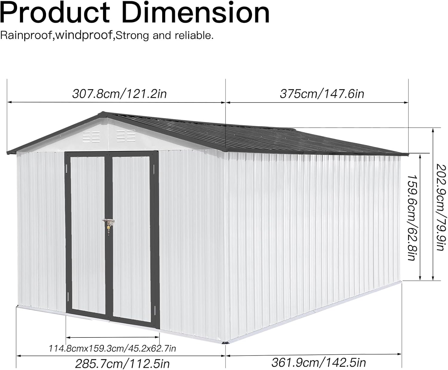 12 x 10 FT Metal Garden Shed, Outdoor Storage Shed with Heavy-Duty Steel Construction, Built-in Punched Vents & Hinged Door, Free Padlock for Secure Backyard, Patio & Garage Storage, White + Grey