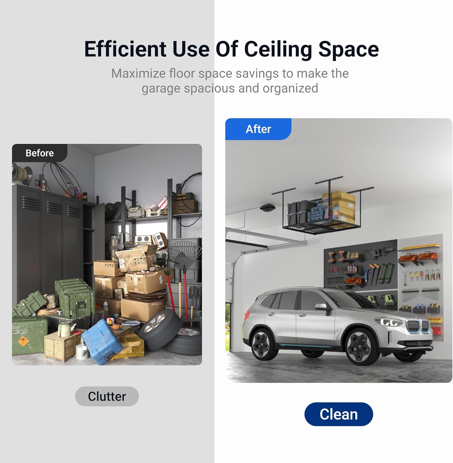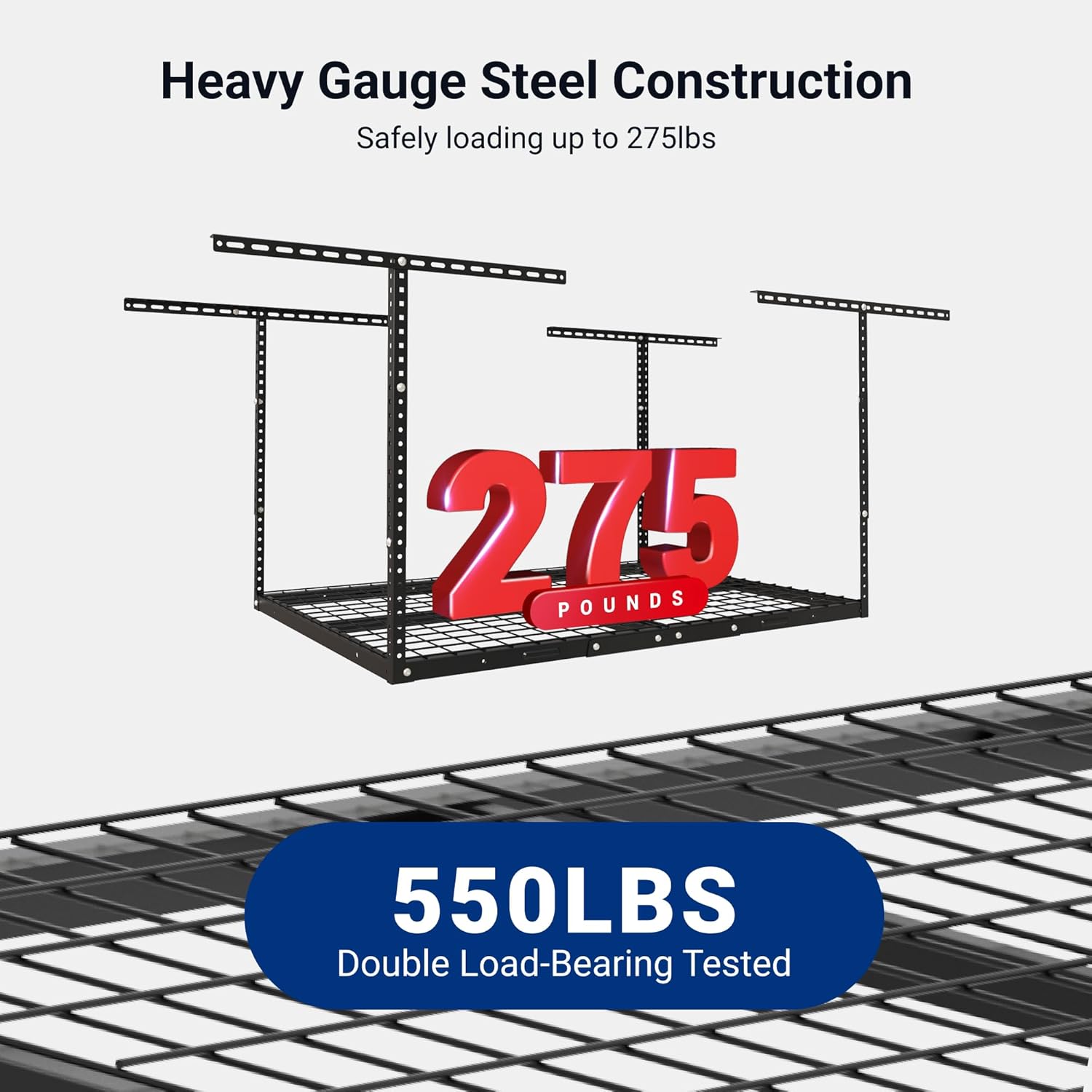 - 550 lbs Tested, 275 lbs Rated: Our overhead garage storage rack undergoes rigorous double load testing (550 lbs) to ensure unmatched safety and durability, supporting up to 275 lbs for your tools and equipment.