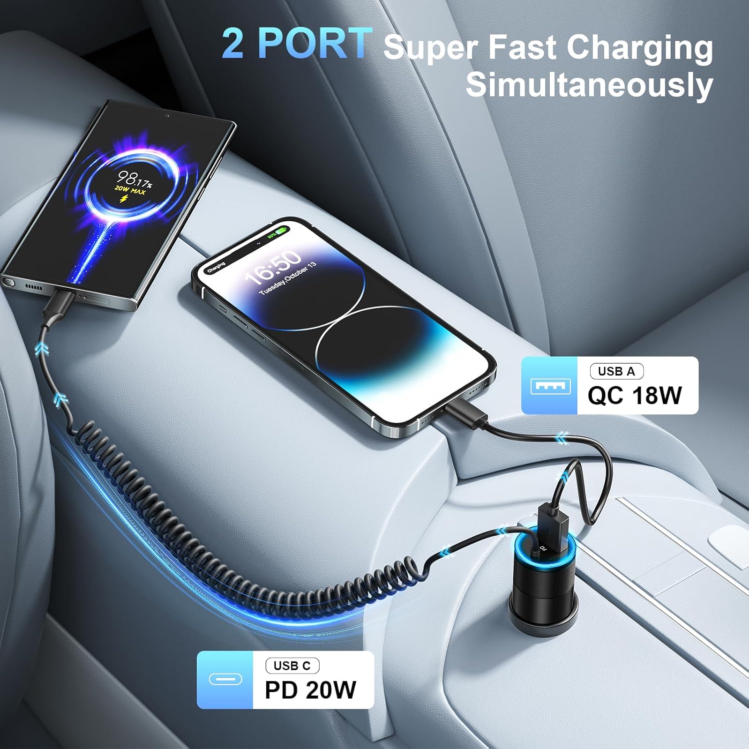 - [Wide Compatibility] Cigarette lighter USB charger with TYPE C built-in coiled cable that is compatible with iPhone 16/15,Samsung Galaxy series,etc. The USB A port is compatible with iPhone 14/13/12/11 Plus Max Pro,Samsung Galaxy S24/S23/S22/S21/S20 Plus/Ultra/S10/Note,HUAWEI, and Google Pixel.Phone charger for car is suitable for 12V-24V car sockets and is compatible with wireless car charger bases, switches, driving recorders and GPS navigation