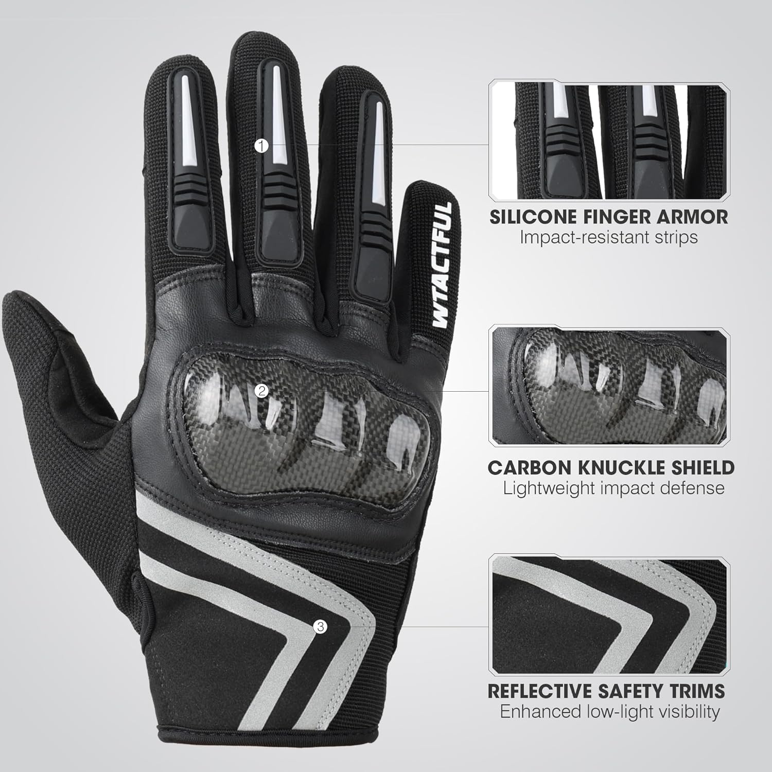 - Protective Carbon Fiber Hard Knuckle Motorcycle Gloves: Features a lightweight carbon fiber knuckle shell for impact protection, with color-matched rubber strips on fingers for added safety and style. Available in three versatile colors: classic all-black, sporty black/white, and high-visibility fluorescent green for enhanced safety.