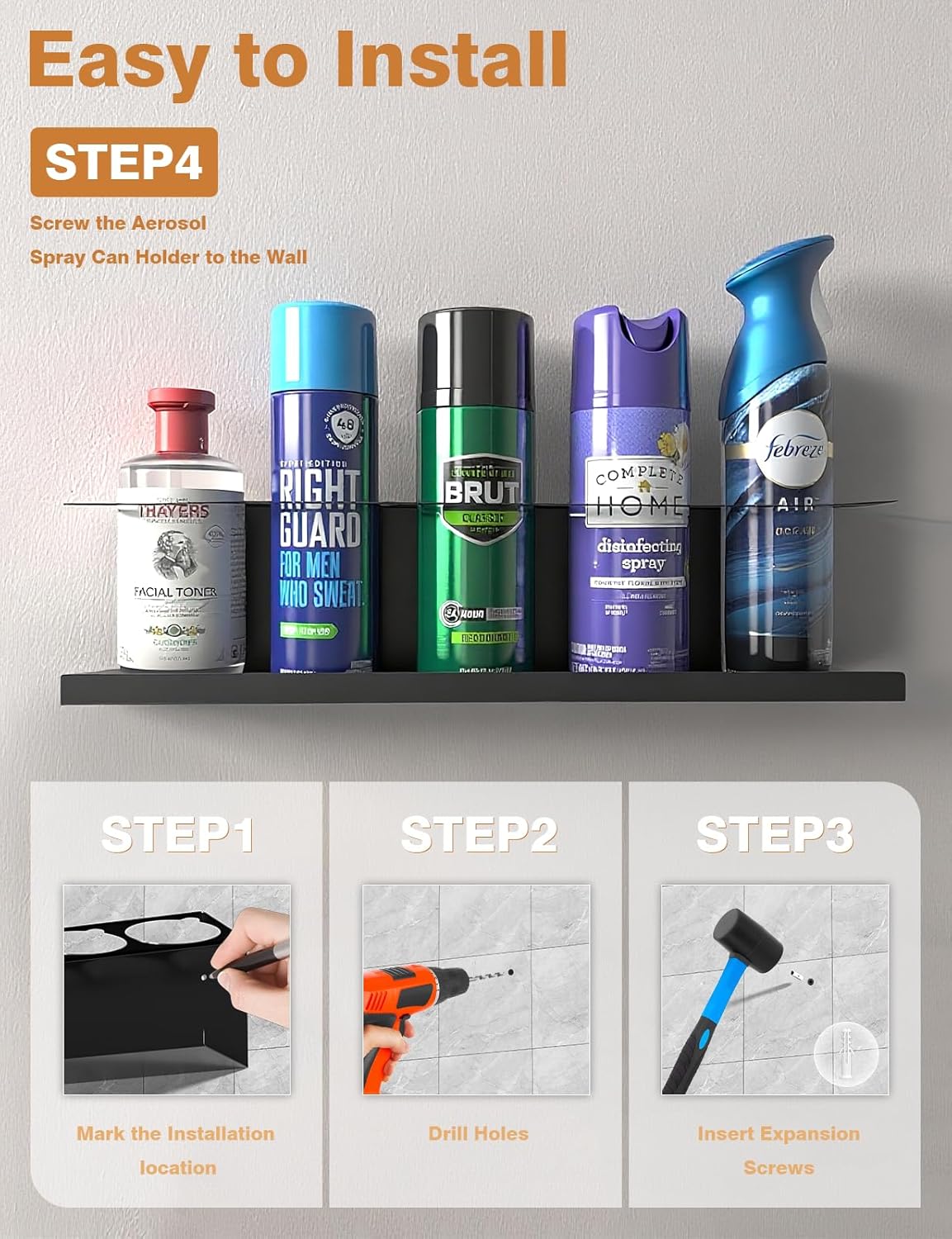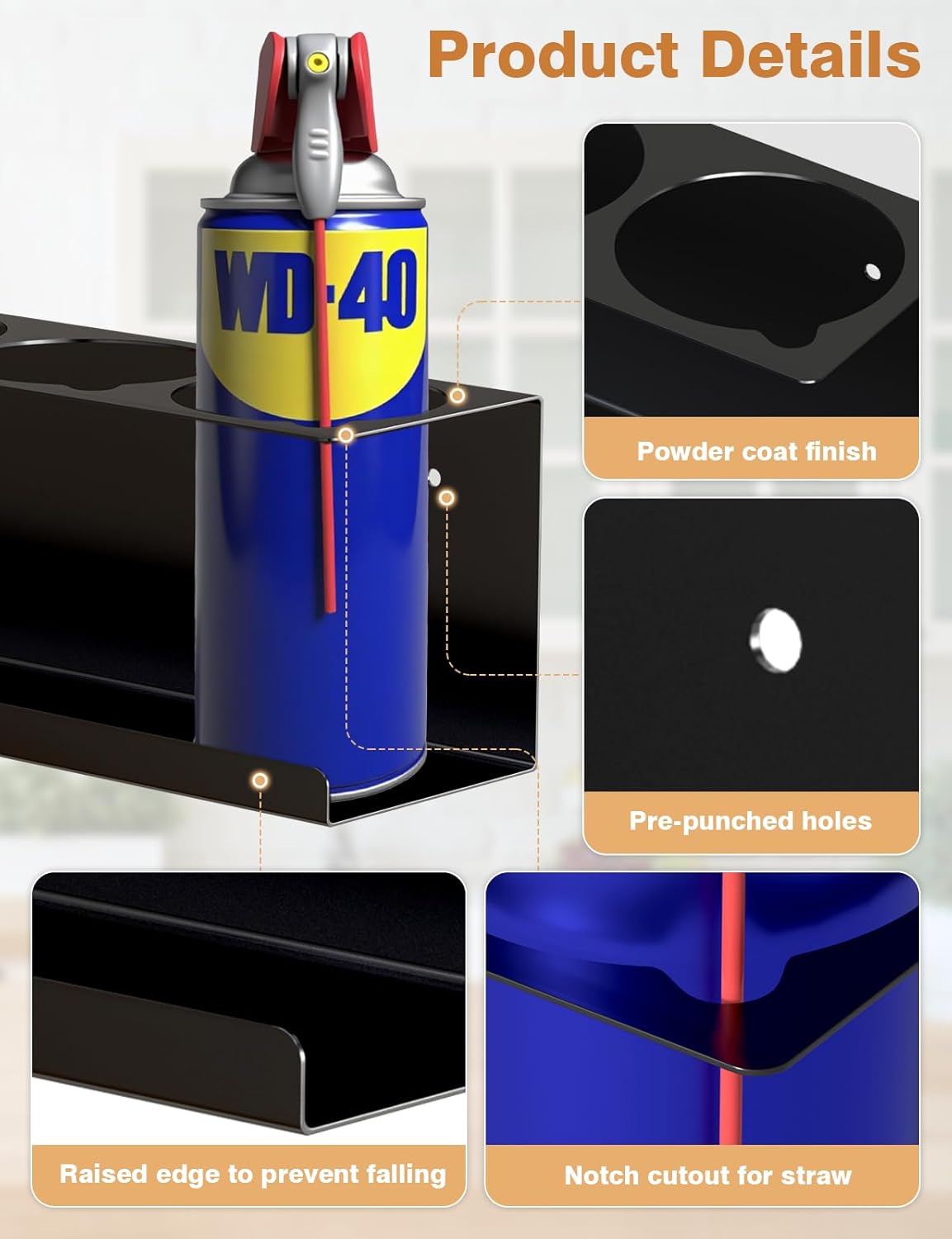 - Ample Storage Capacity - The bottle holes of this metal spray can storage rack are 3" in diameter, each shelf can hold 5 cans, the package includes 4 brackets and mounting accessories, which can hold up to 20 cans. Perfect for storing cleaning supplies, handyman tools, car care products, hair spray or any other aerosol products.