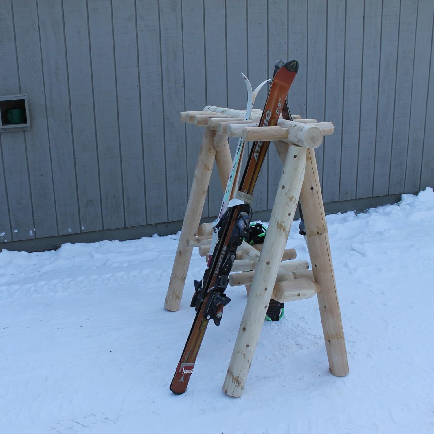 - 100% NORTHERN WHITE CEDAR CONSTRUCTION: Crafted from durable Northern White Cedar logs, this wood storage rack combines strength and rustic appeal. Use it unfinished to allow a silver-gray patina or stain it to match your existing garage storage setup. Whether it’s used as a ski rack for garage interiors or an outdoor snowboard storage rack, it offers a natural look and dependable performance season after season.