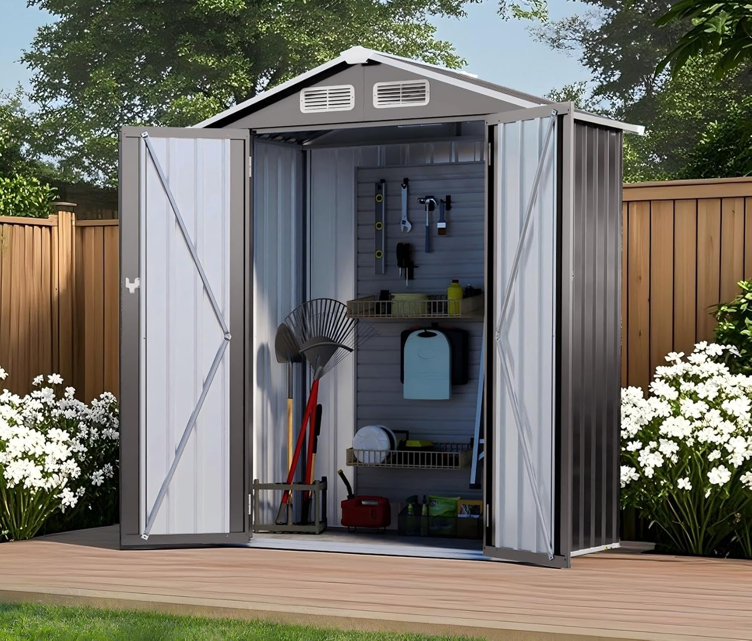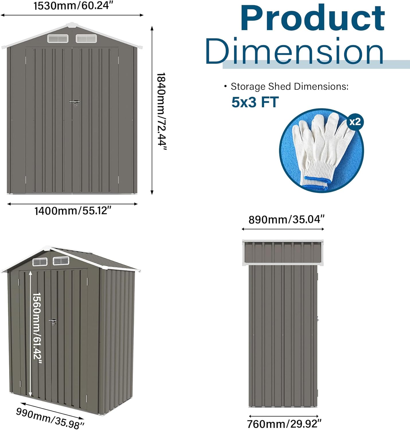 - 5X3 FT Outdoor Metal Storage Shed - 5X3FT (approximately 60.24×35.04×72.44 inch), suitable for balcony and courtyard corners. It can easily accommodate garden tools, sports equipment and daily miscellaneous items. The internal space can be equipped with shelves and hooks to achieve orderly and categorized storage.