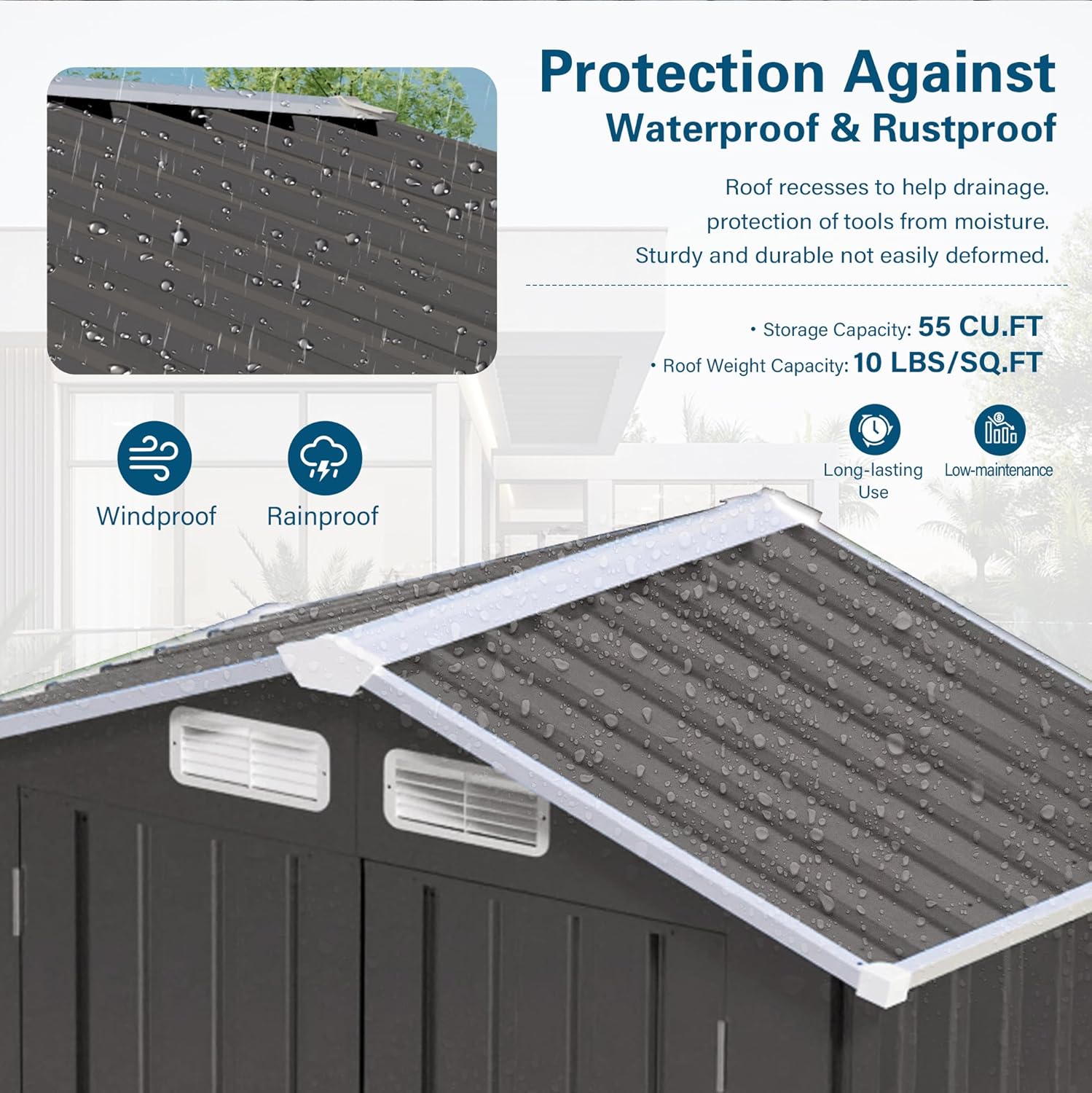 - High Quality Material - Made of prepainted galvanized steel plate, it undergoes multiple anti-rust treatments. Equipped with a sealed waterproof roof and wind-resistant structure, compared with wooden or plastic storage sheds, metal material boasts have higher strength and durability. It is less prone to deformation, cracking, and fading, and requires less frequent maintenance. This will saves time and costs, it is a reliable choice for long-term outdoor storage.