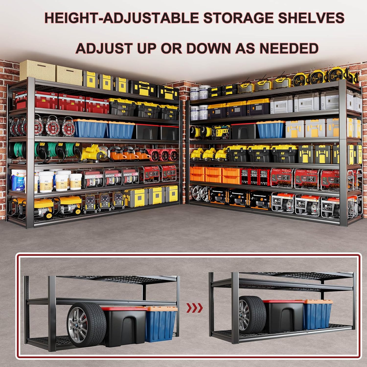 - 【Adjustable Heavy Duty Metal Shelves to Meet Different Needs】The height of each tier can be adjusted not only by moving the crossbar to meet the needs of different heights, but also the shelves can be assembled or disassembled into a variety of different metal shelves. The 84-inch tall 3900 lb. load-bearing garage shelves are not only strong, but they also give you more storage space.