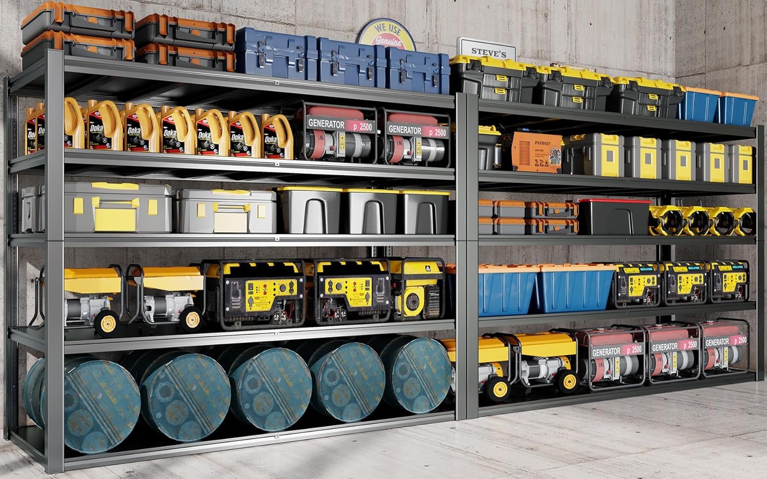- 【3500LBS HIGH LOAD CAPACITY】The thickened metal mesh of the metal frame combines with the double metal shelves of the uprights to give the all-metal storage shelves an ultra-high weight-bearing capacity of 3500LBS. The 63 in wide shelving unit ensures plenty of space for storing heavy items on your garage storage shelves.