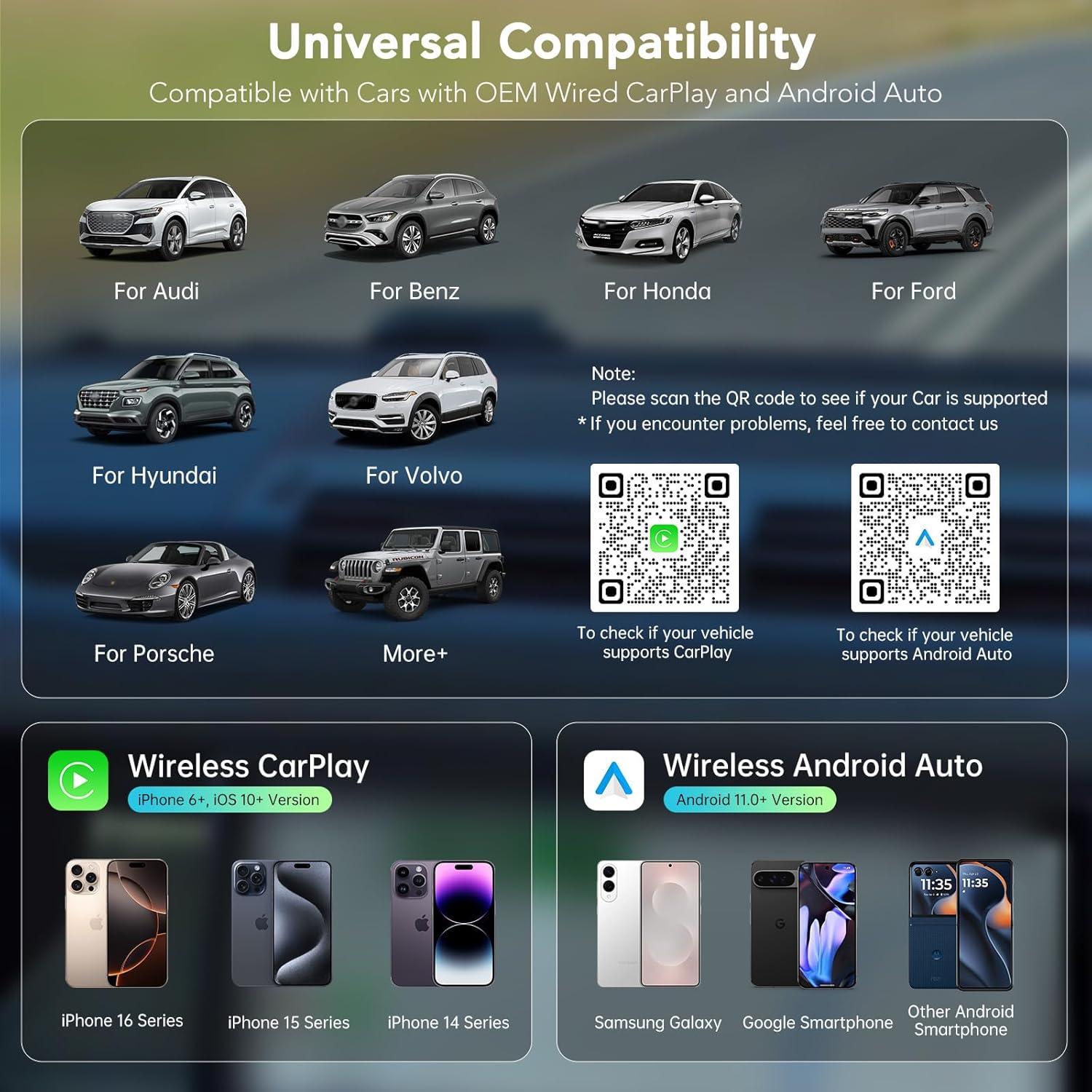 - πΌππππ-πͺππππππ & πΌππππππππππ πͺπππππππππ: This carplay wireless adapter hides in your USB port, freeing up space. Compatible with more than 1000+ car modelsβno brand-specific terms needed. πππππππππ: Only compatible with cars that have original factory wired CarPlay & Android Auto, typically 2016+ for most brands, and 2020+ for some models from T-oyota, L-exus, I-nfiniti, etc.!!!