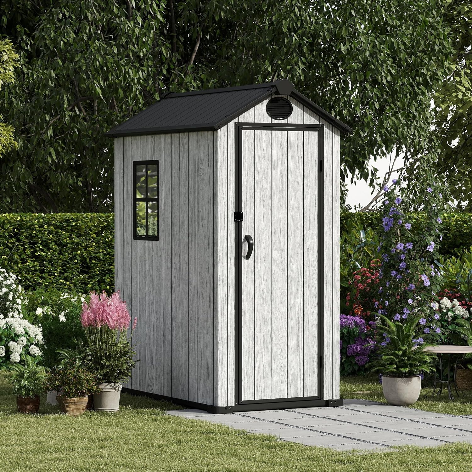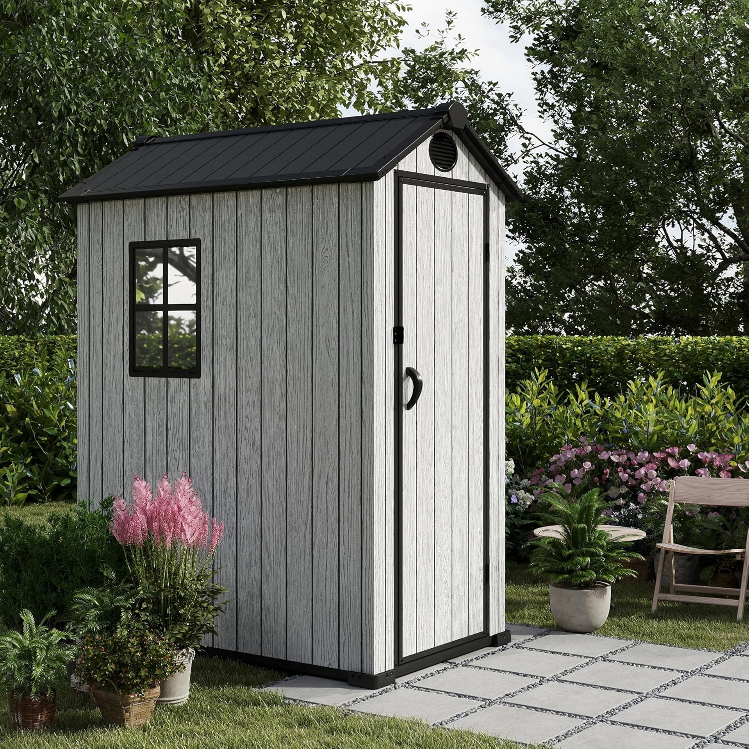 - Side Window for Light and Ventilation, A small built-in window on the side of the shed improves air circulation and natural light, ideal for use in your backyard, patio, or garden space.