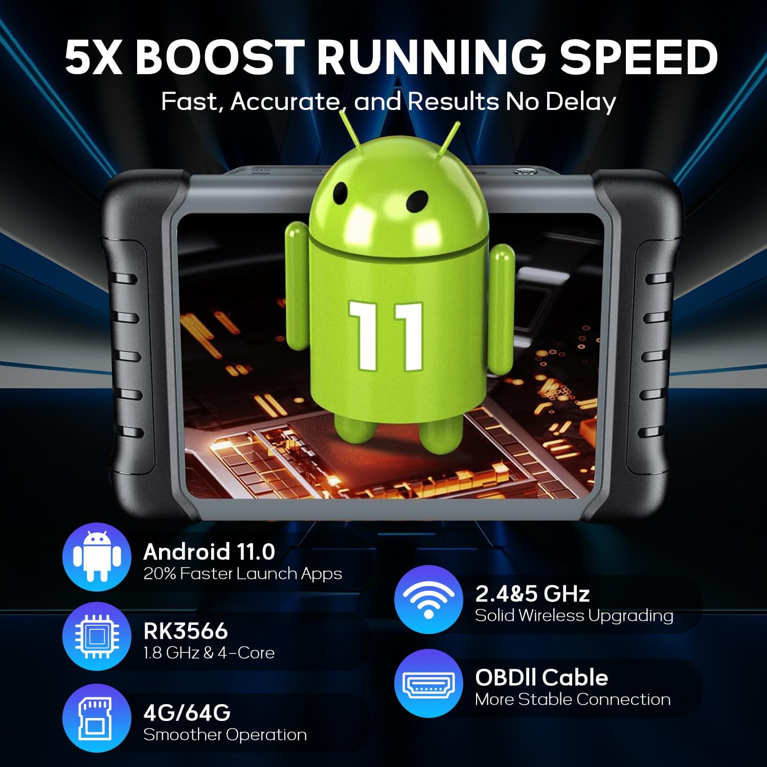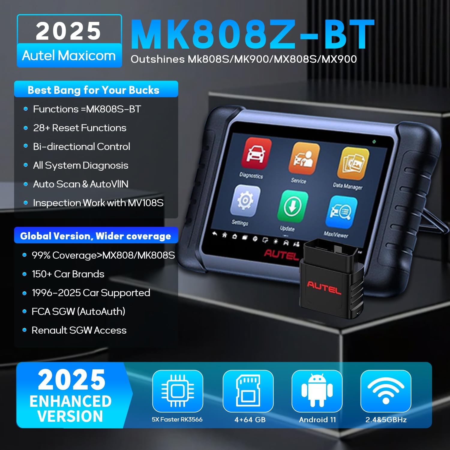 - [Upgraded 2.0 Version with 5X Faster Performance] Autel MK808Z-BT (2.0 version of MK900/MX900/MK808S/MK808Z) features Android 11 OS, 5X faster RK3566 CPU, 4GB+64GB memory, and dual 2.4&5GHz Wi-Fi for seamless multitasking. Includes exclusive upgrades: bidirectional control, 3000+ active tests, FCA SGW (2018+), and compatibility with 150+ makes (1996-2025 models).