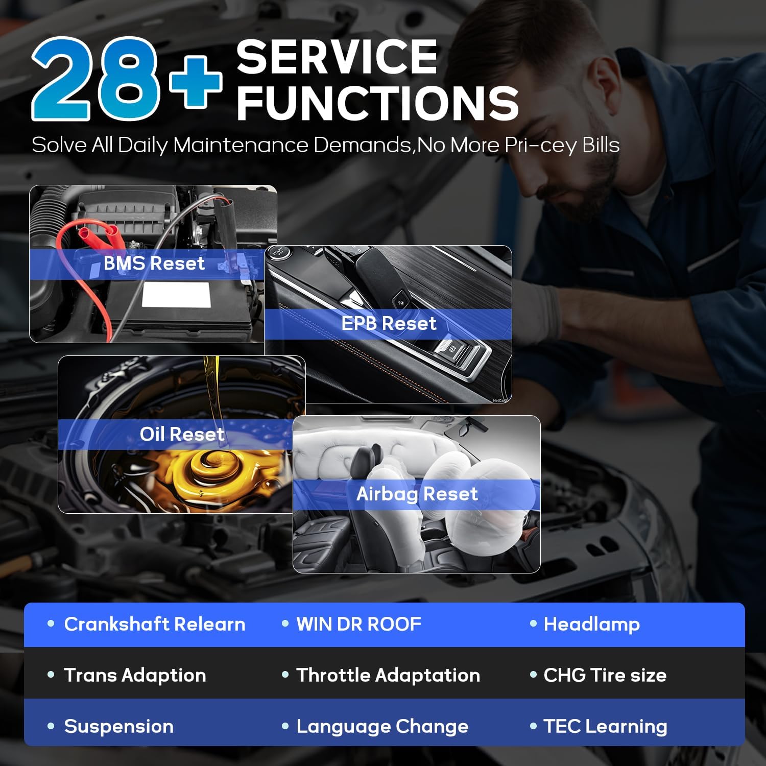 - [28+ Service Functions & All-System Diagnostics] Perform essential maintenance: Oil Reset, EPB, ABS Bleed, SAS Calibration, BMS, Injector Coding, and more. Access all vehicle modules (ABS, SRS, Engine, Transmission, etc.) to read/clear 7000+ DTCs, view live data (text/graph), and retrieve ECU info. AutoVIN (2006+) identifies vehicles in seconds.