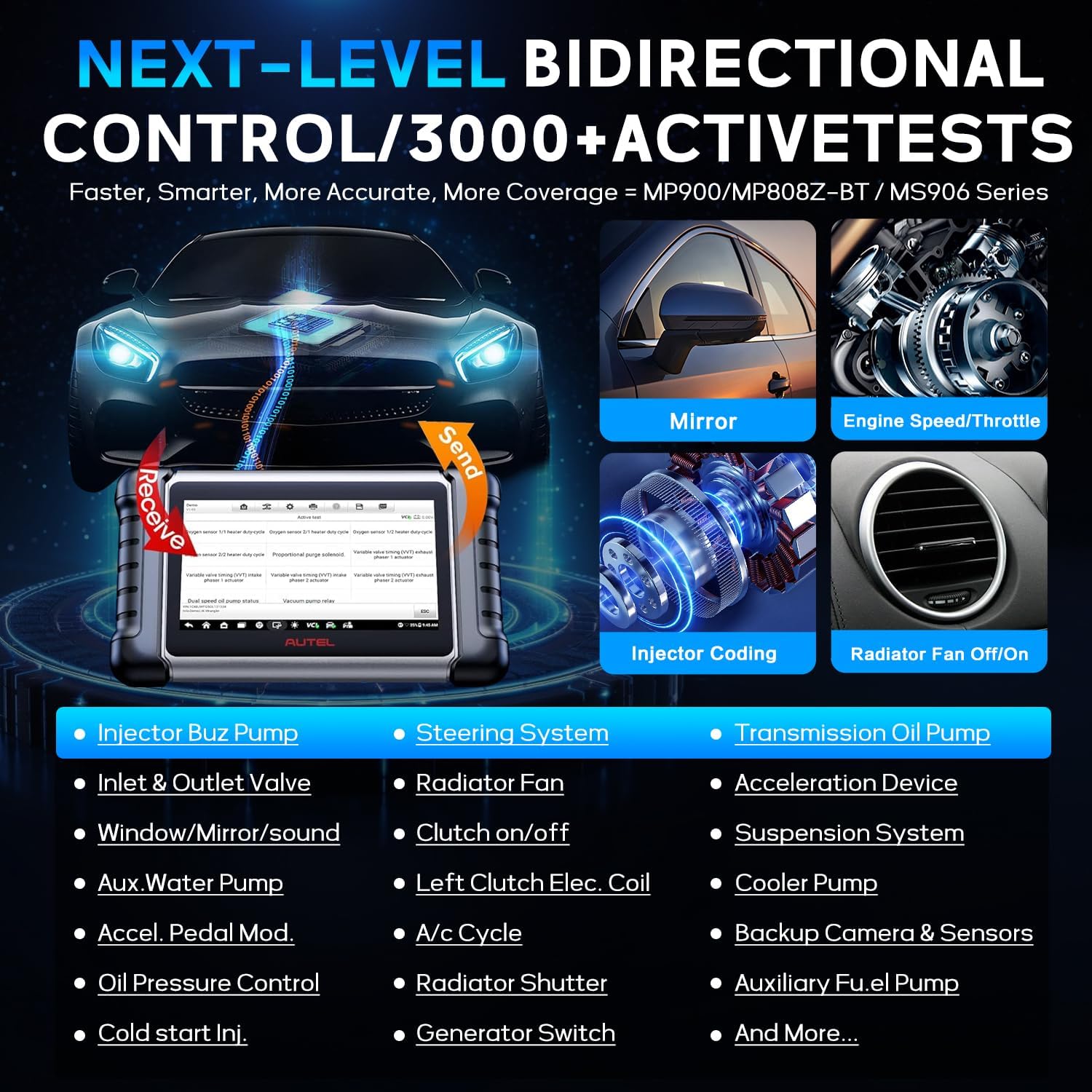 - [Full Bidirectional Control & 3000+ Active Tests] Send commands to 99% of vehicle actuators to test functionality without manual controls: activate radiator fans, modulate throttle, operate windows/mirrors, test injectors, control lights/wipers, and more. Identifies faulty components quickly—same advanced capabilities as MP900BT/MS906BT.