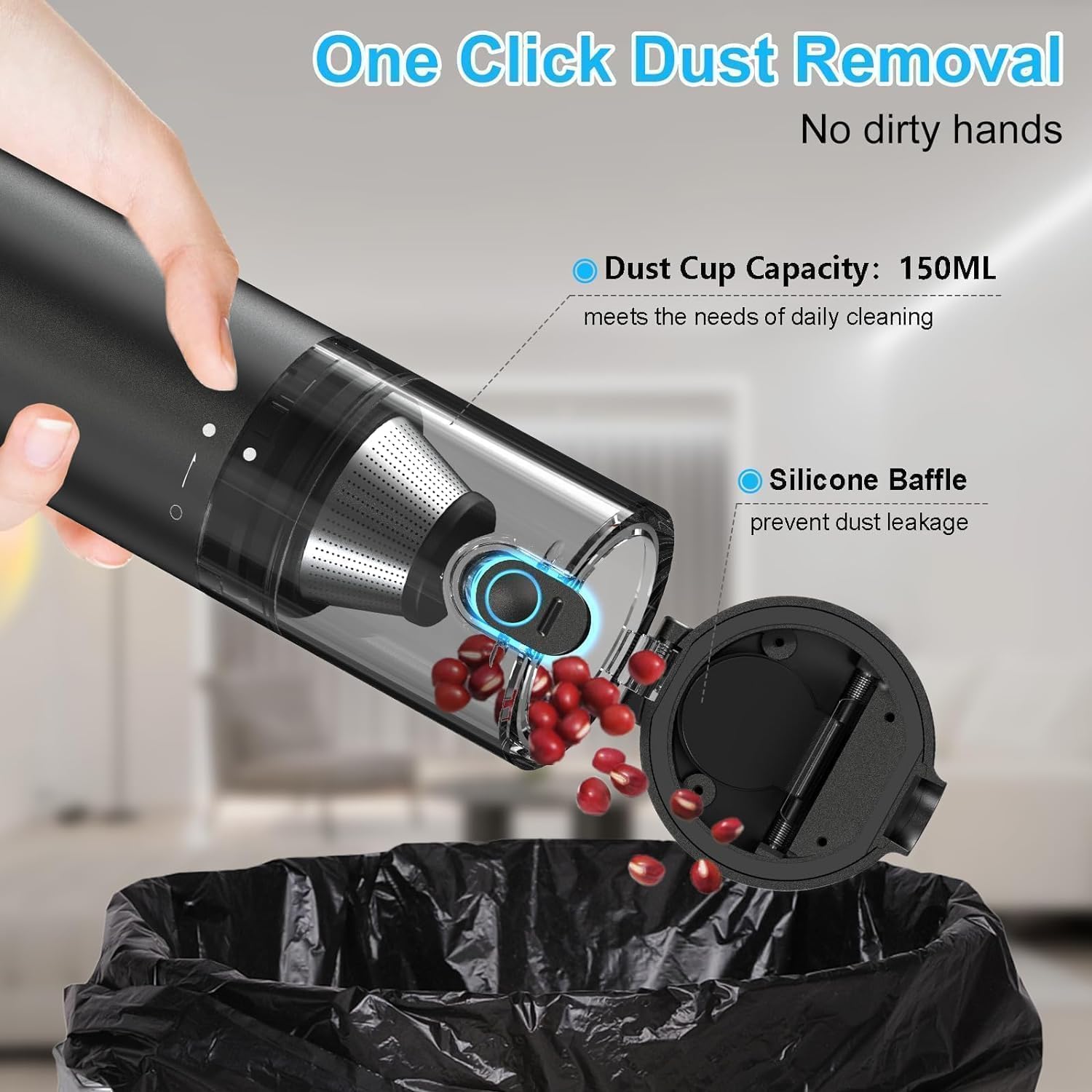 - 【TWO LARGE CAPACITIES】This car vacuum portable cordless cleaner comes with a large 8,000mAh battery, which can be rapidly charged in just 4 hours. Additionally, the car vacuum is equipped with a sizable 150ml dust box, perfectly meeting your daily garbage collection needs.