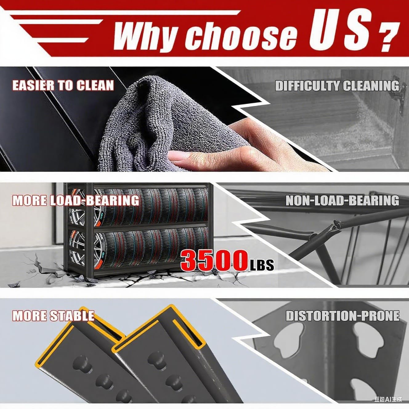 - 【Heavy-Duty Steel Construction】Built with durable cold-rolled steel, this garage shelving unit features thickened uprights and cross beams for reliable stability. The scientific frame design of this metal shelving evenly distributes weight, minimizing concerns about shifting or bending—making it more sturdy than common plastic or wooden storage shelves. With a 3500-lb capacity, this metal shelving system is a practical solution for garage storage needs, pairing well with other garage shelves for organized space