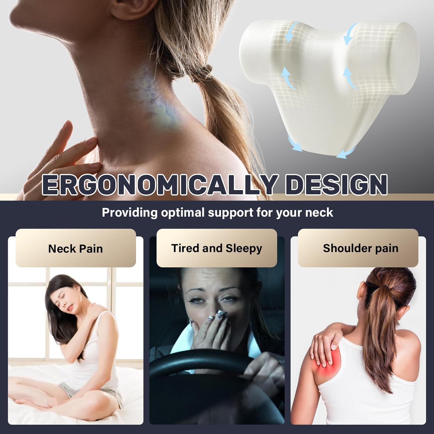 - Ergonomic Design: This car neck pillow is designed with ergonomic memory foam, which has slow-rebound performance, ensures the neck pillow fills the gap between car seat and your neck, absorb and relieve stress on your neck and shoulder. Once in place, it conforms to the shape of your neck, it provides the neck support that the original car seat lacks
