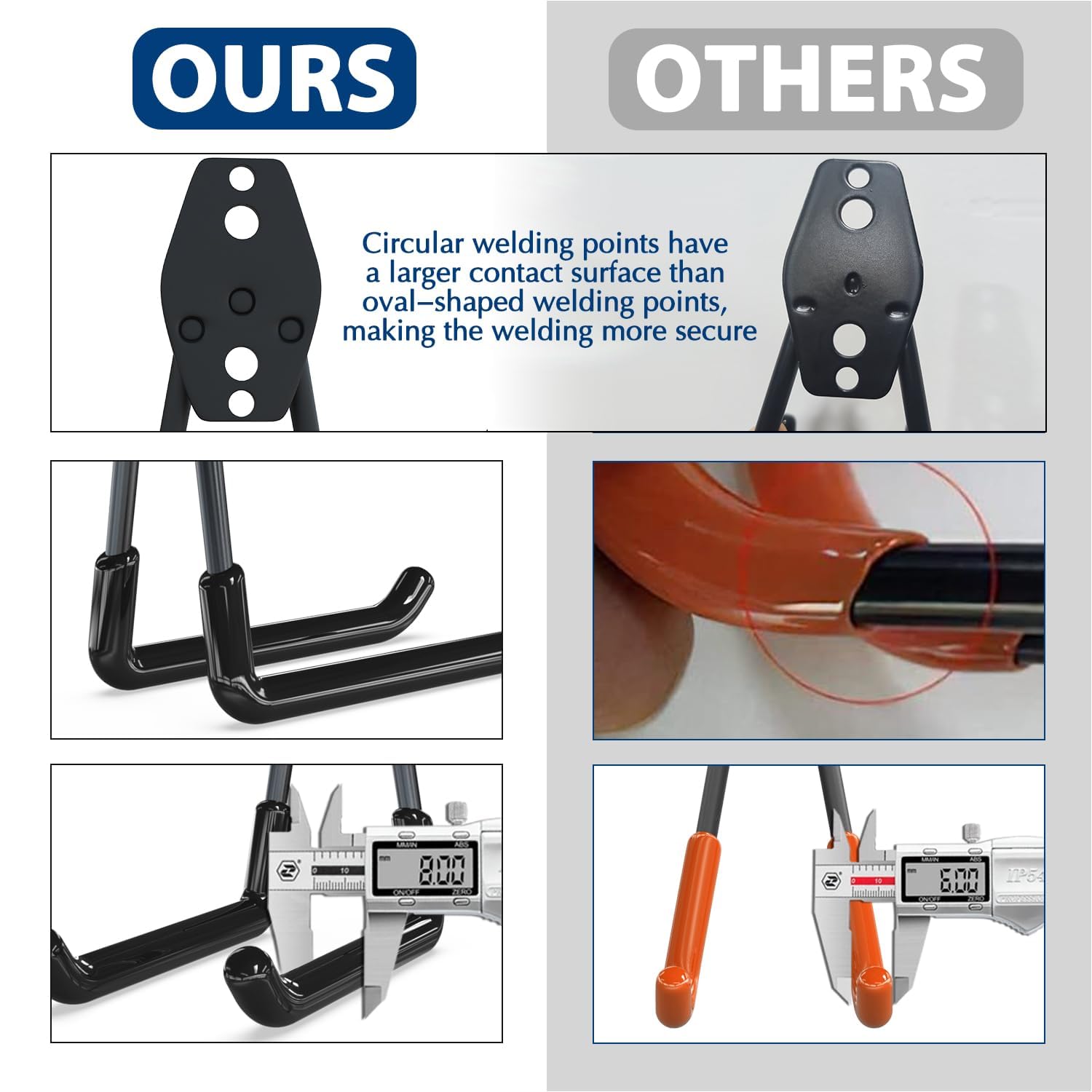 - Upgrade Design for Garage Storage Hooks: Different from other similar garage hooks heavy duty with oval-shaped welding points, our designed circular welding points. These provide a larger contact surface between the hook and the backboard, offering higher security. With this design, there’s no need to worry about the rear steel panel splitting or falling off, a perfect choice of wall hooks for hanging heavy duty