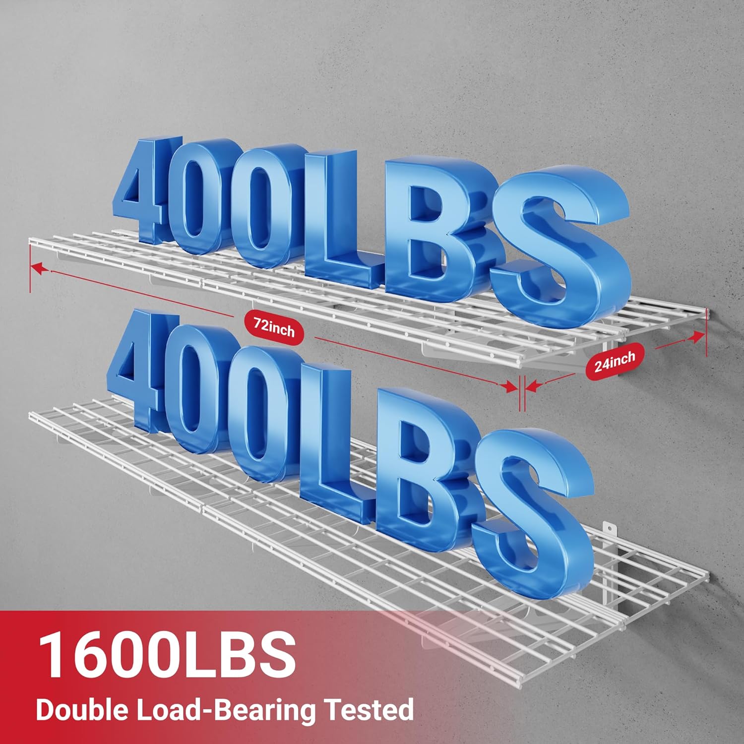 FLEXIMOUNTS 2-Pack 2x6ft Garage Shelving with Hooks, 24-inch-by-72-inch Wall Shelf Garage Storage Racks Floating Shelves, White