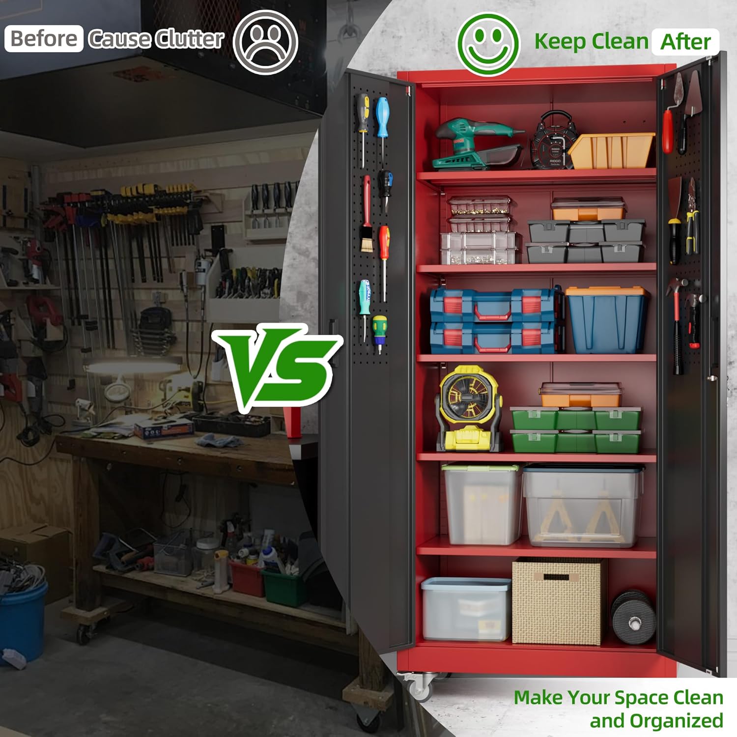 Garage Storage Cabinet with Pegboard and 5 Adjustable Shelves, 71'' x 32'' x 16''Metal Lockable Cabinet with Magnetic Doors,Tool Storage,Home Office Garage,Gym,School (Black-red)
