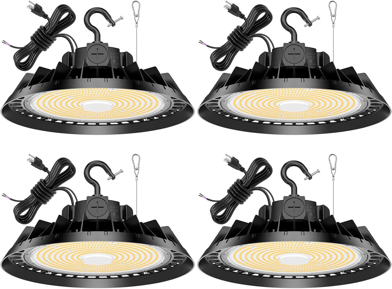 4Pack LED High Bay Lights, 150W UFO High Bay LED Shop Lights, 22500LM Adjustable CCT(5700K 5000K 4500K) & Power(150W 120W 80W), 0-10V Dimmable, 5' Cable Plug, IP65 Waterproof, ETL & DLC Listed