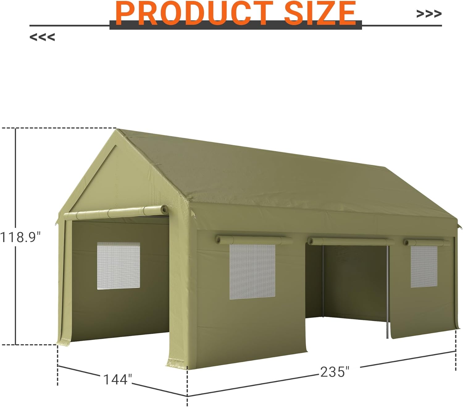 12x20 FT Carport, Heavy Duty Carport, Portable Garage with Side-Opening Door & Roll-Up Windows, Car Canopy Reinforced Four-Hole Base for Car, Truck, Boat, Motorcycle, Green