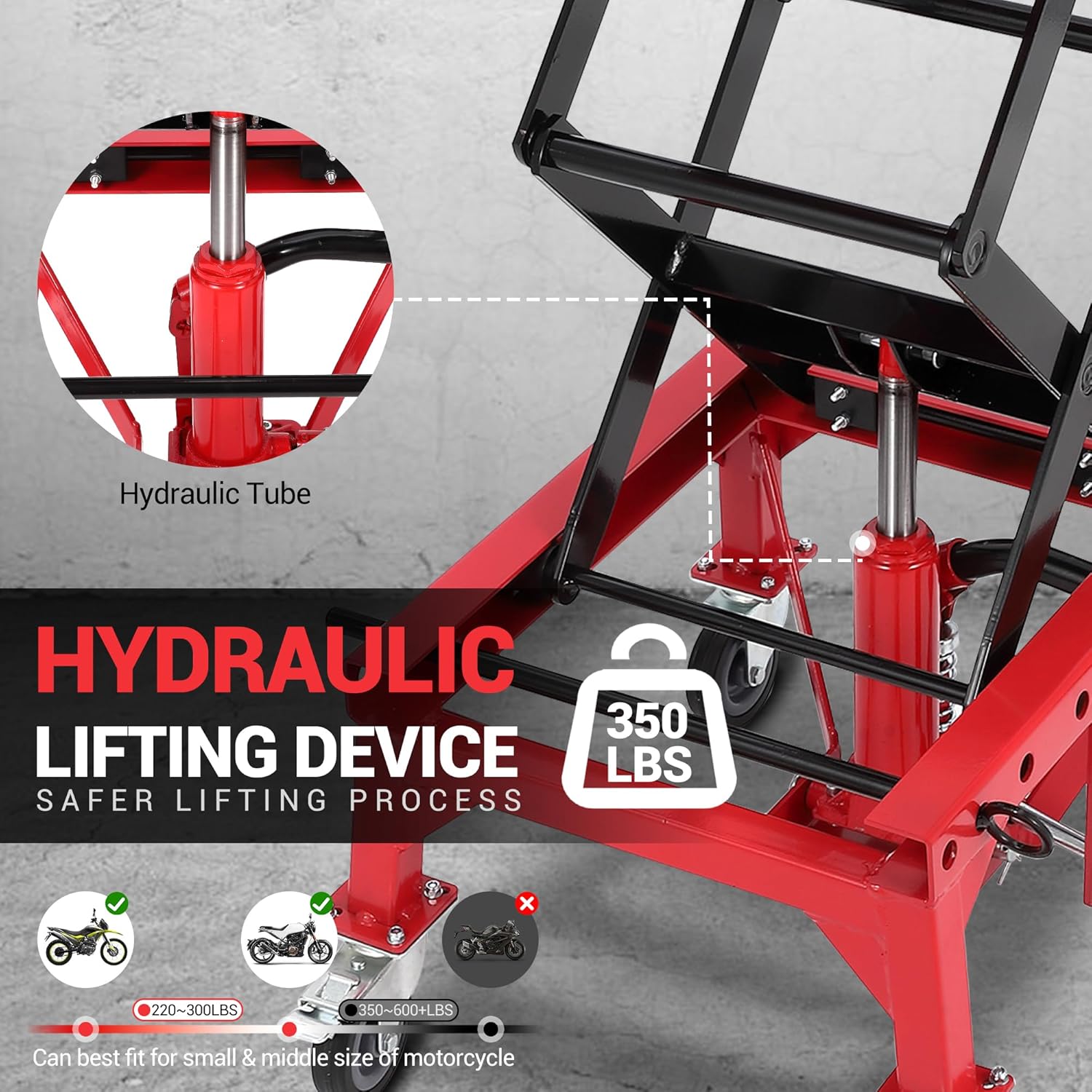 - Exceptional Safety with Heavy-Duty Construction ✔ 350 lbs Capacity & Solid Steel Frame: High-strength worm gear transmission and scissor structure ensure secure lifting for motorcycles, ATVs, and dirt bikes. ✔ Safety Pin & J-Hook: Prevents shaking or overturning during maintenance. Locking pole and bolt add double protection against accidental drops. ✔ Anti-Slip Rubber Pad: Striped veins on the top surface protect your vehicle from scratches and slippage.