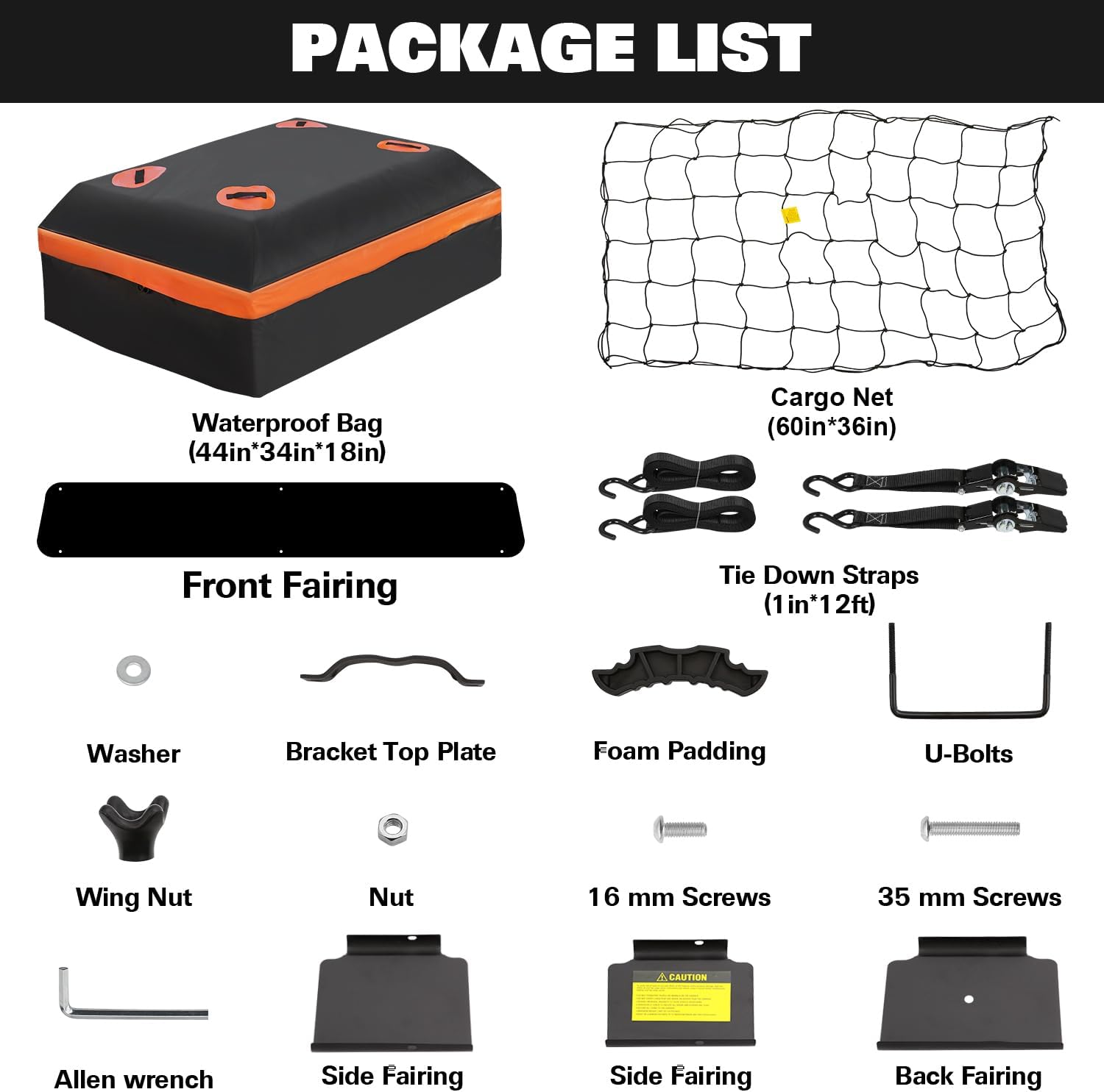 - Included Accessories: Comes with a waterproof bag, a cargo net with attachment hooks, and a pair of ratchet tie-down straps for secure cargo transport.